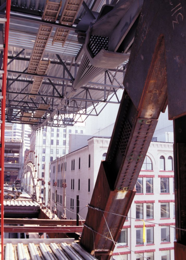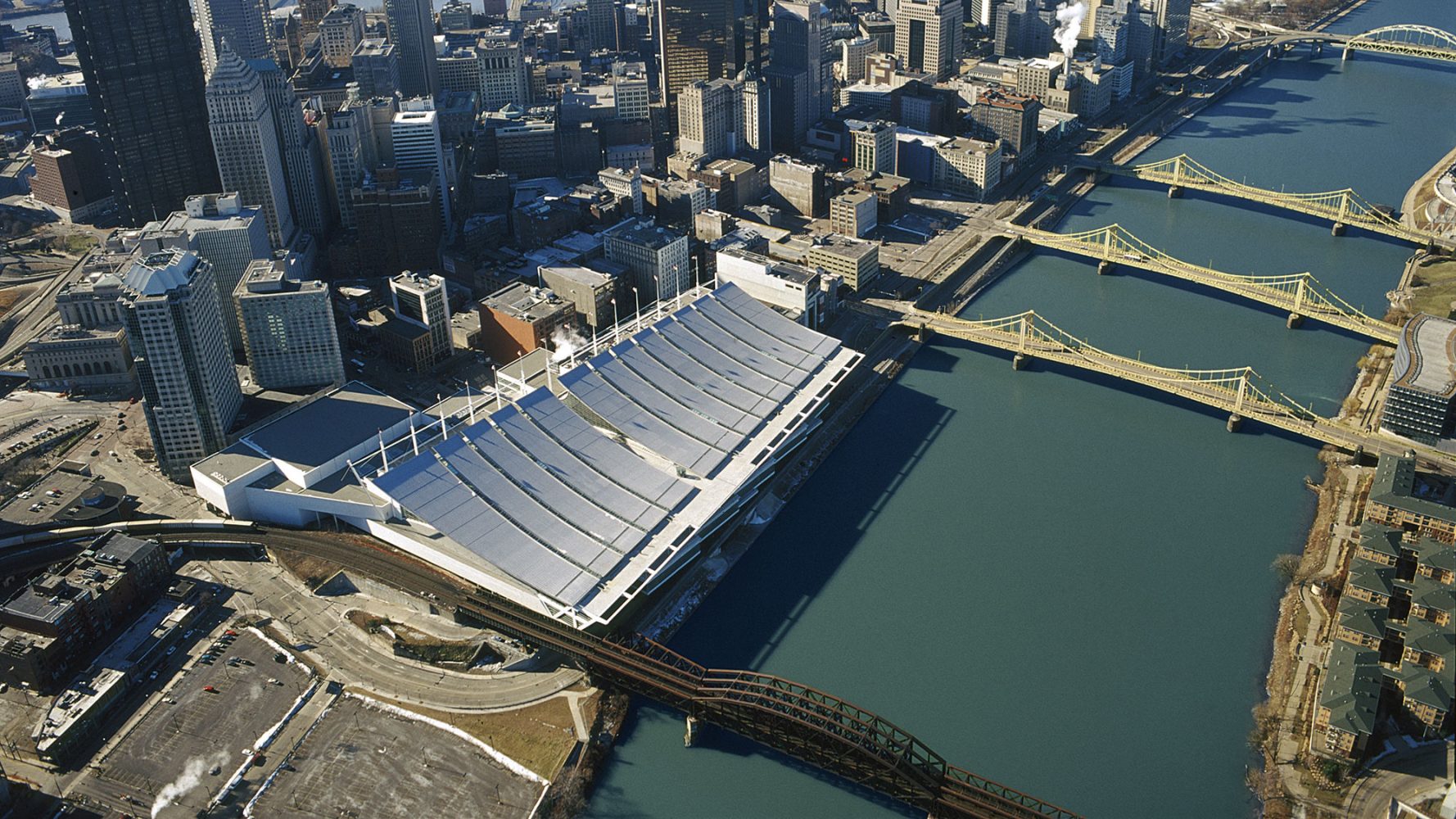 La cubierta suspendida de este centro de convenciones tiene una superficie de 134.700 metros cuadrados e integra en un único gesto ascendente los requisitos contextuales, ambientales, estructurales y programáticos del proyecto. Su icónico diseño está inspirado en los históricos puentes suspendidos que cruzan el río Allegheny junto a su emplazamiento en la ribera y constituye el último capítulo de la larga historia de innovaciones tecnológicas y de ingeniería de Pittsburgh. Esta excepcional estructura de cables de acero posibilitó la construcción de un salón de exposiciones de 23.230 metros cuadrados sin columnas y con luz natural.