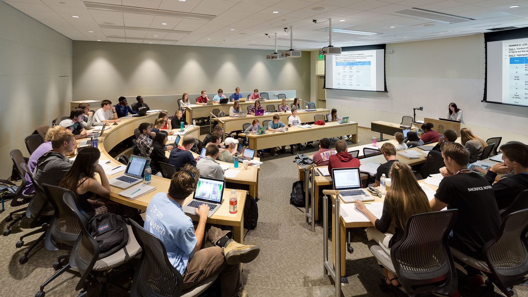 The adjacent Carolina Coliseum is also reflected in the design for the business school in its overall massing, with the alignment of fourth-floor faculty offices to the Coliseum’s roof and the classroom plinth to its base, and with the rhythm of its colonnade. The University emphasized that activation of the adjacent site would occur in the future so the design needed to anticipate two potential scenarios for the Coliseum building–either its adaptive reuse or its demolition.