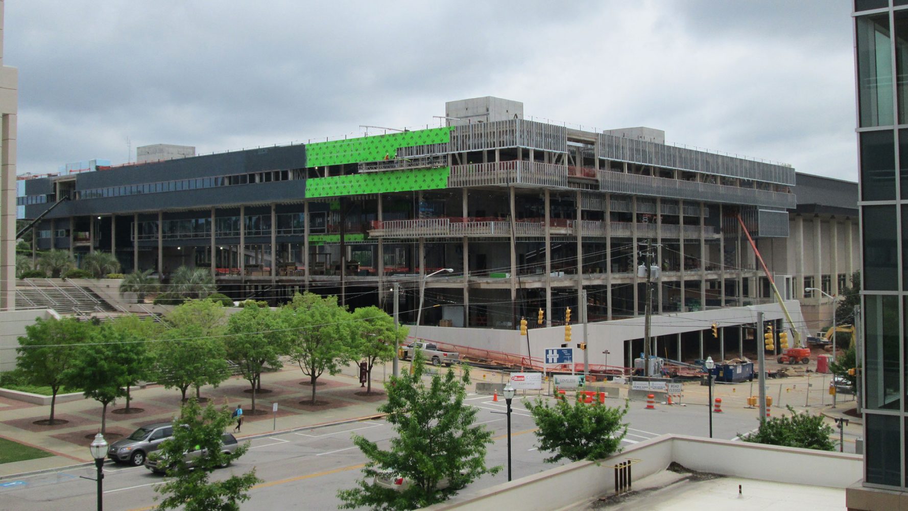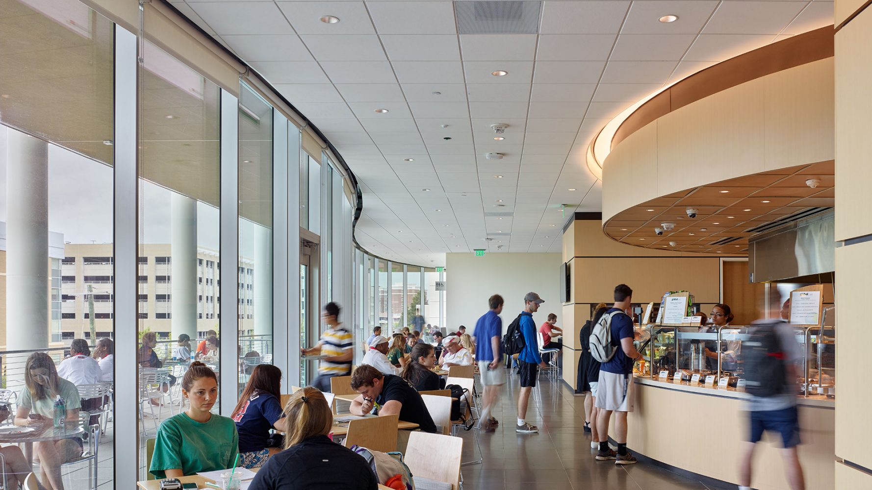 The building design takes advantage of the steeply sloped site, featuring magnificent views of the Congaree River from the top floors, and housing auditoria, classrooms, and other spaces that require minimal natural light in the base plinth. Upper levels wrap around the courtyard with each floor plate extending out to different extents according to programmatic needs and creating energy savings through the passive self-shading of lower floors. The highest floors are shaded with shading elements. A 500-seat auditorium has been designed to host performances for the School of Music as well as plenary sessions and large campus gatherings for the university, in addition to School of Business lectures.
