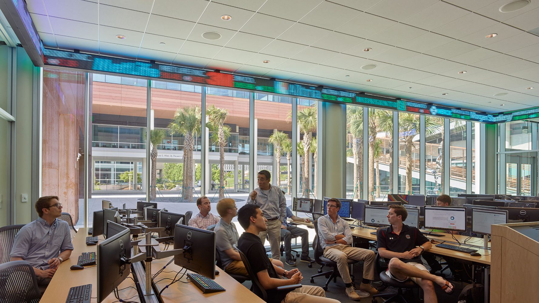 The building program stimulates learning through the most up-to-date means of technology, including a trading room with stock market ticker boards and classrooms equipped with tele-presence technology. A green rooftop terrace, along with the Palmetto Court and terraced areas, promote interaction and collaboration among faculty, students, and community members.