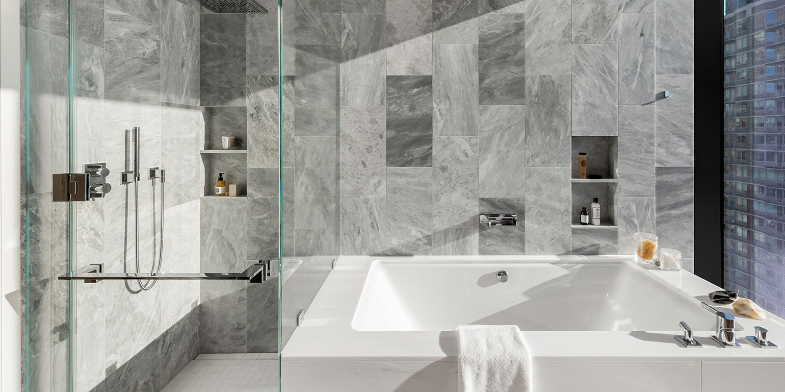 The tower’s modern architecture pays homage to nearby New York City signature towers, such as the Empire State Building, and other high rises from the late 1930s and early 1940s, respecting their verticality without imitating their interiors. Many natural stone and wood materials were incorporated into the interior design, such as marble, travertine, walnut, and oak, for the kitchen cabinets, countertops, and flooring.