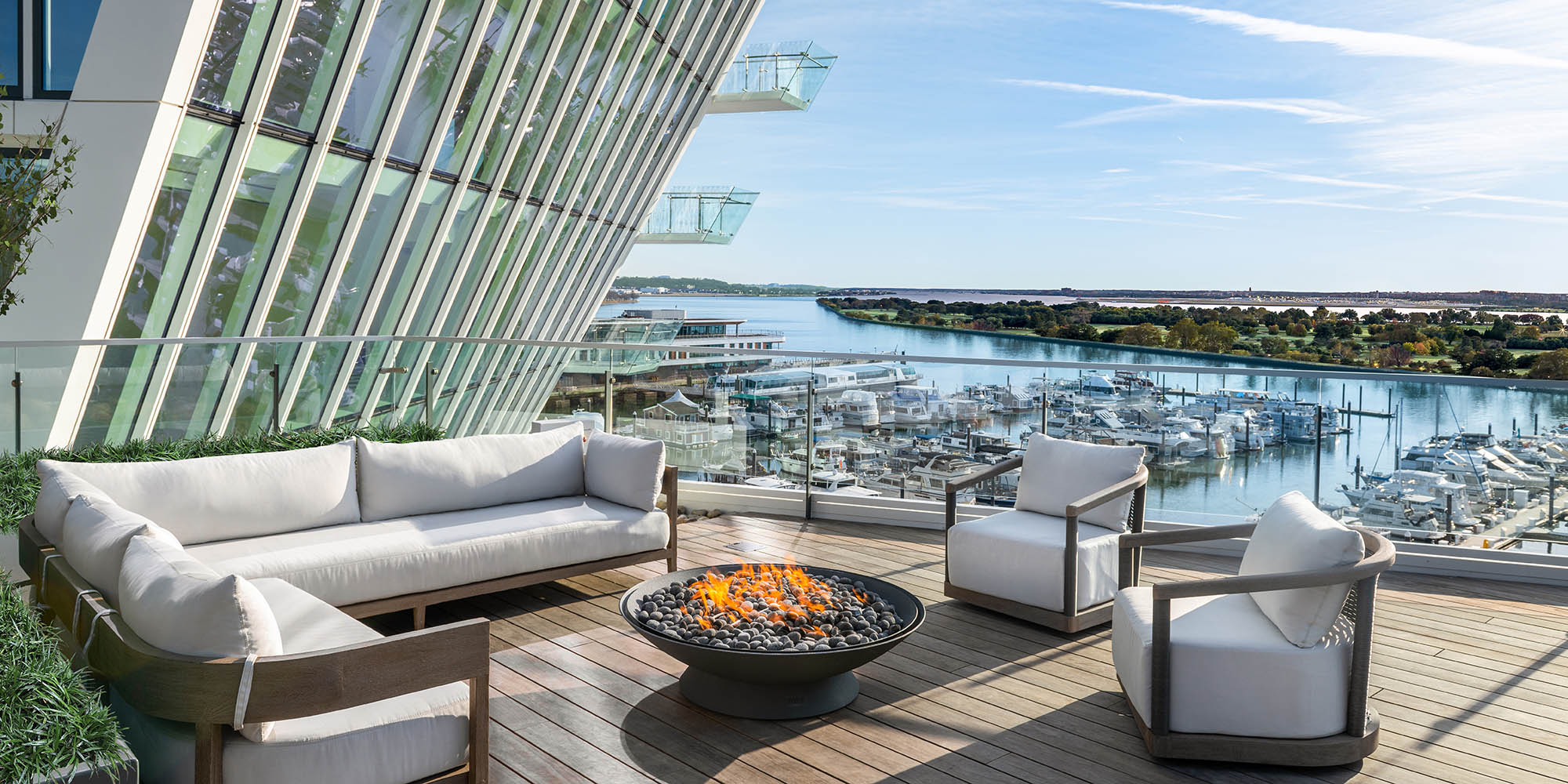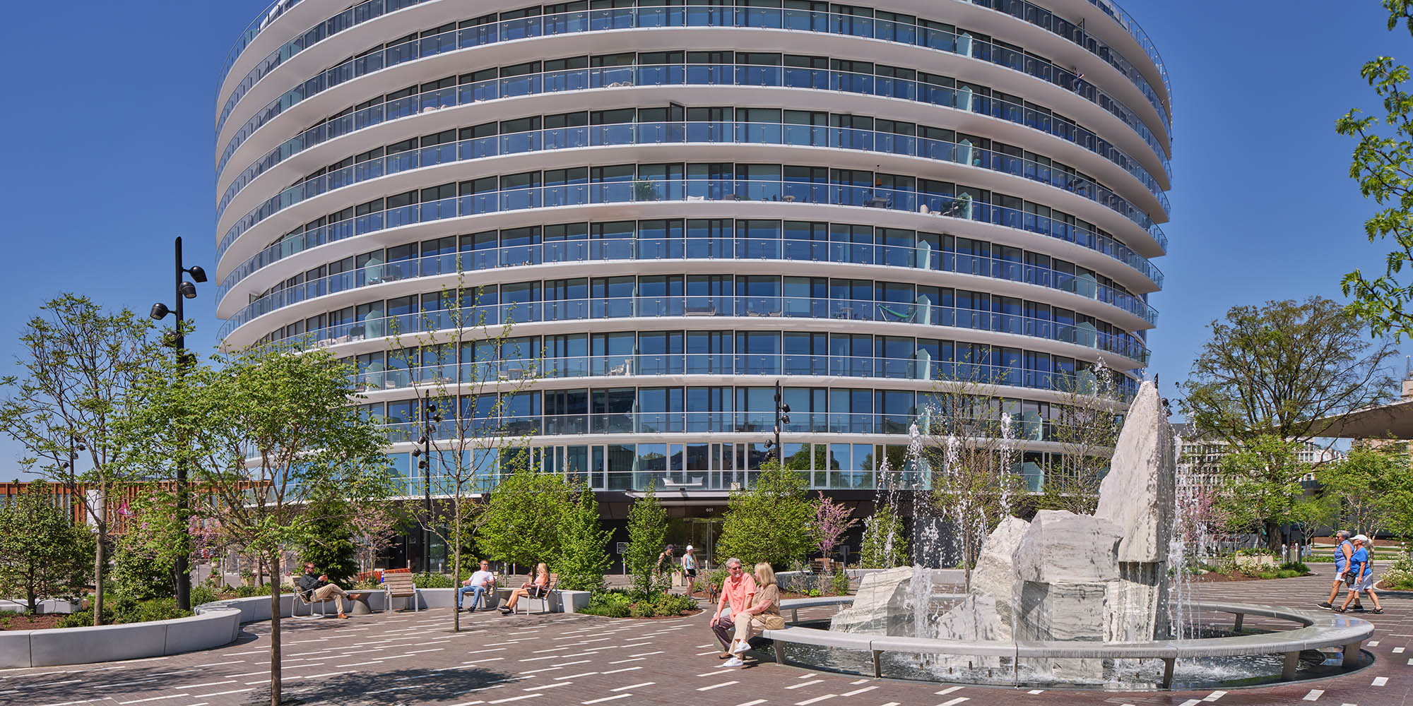 Forming a terminus to a row of buildings in The Wharf development of Washington D.C., the Amaris is a mixed-use residential building designed by Rafael Viñoly Architects with a unique form that maximizes views, allows daylight deep within each residential unit, and creates a recognizable and distinctive form along the Potomac River waterfront. The building overlooks the new M Street Landing Park, The Amaris’ new central public space.