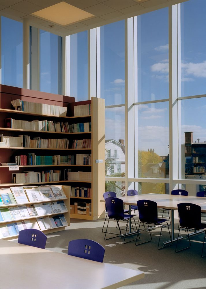 一个三层的几乎贯穿整个街区的中庭组织了为学生,教师,访问学者和政策制定者服务的各种功能,连接所有空间,包括一个藏书丰富的图书馆,教室和会议空间。自然光线通过玻璃沐浴到整个中庭。