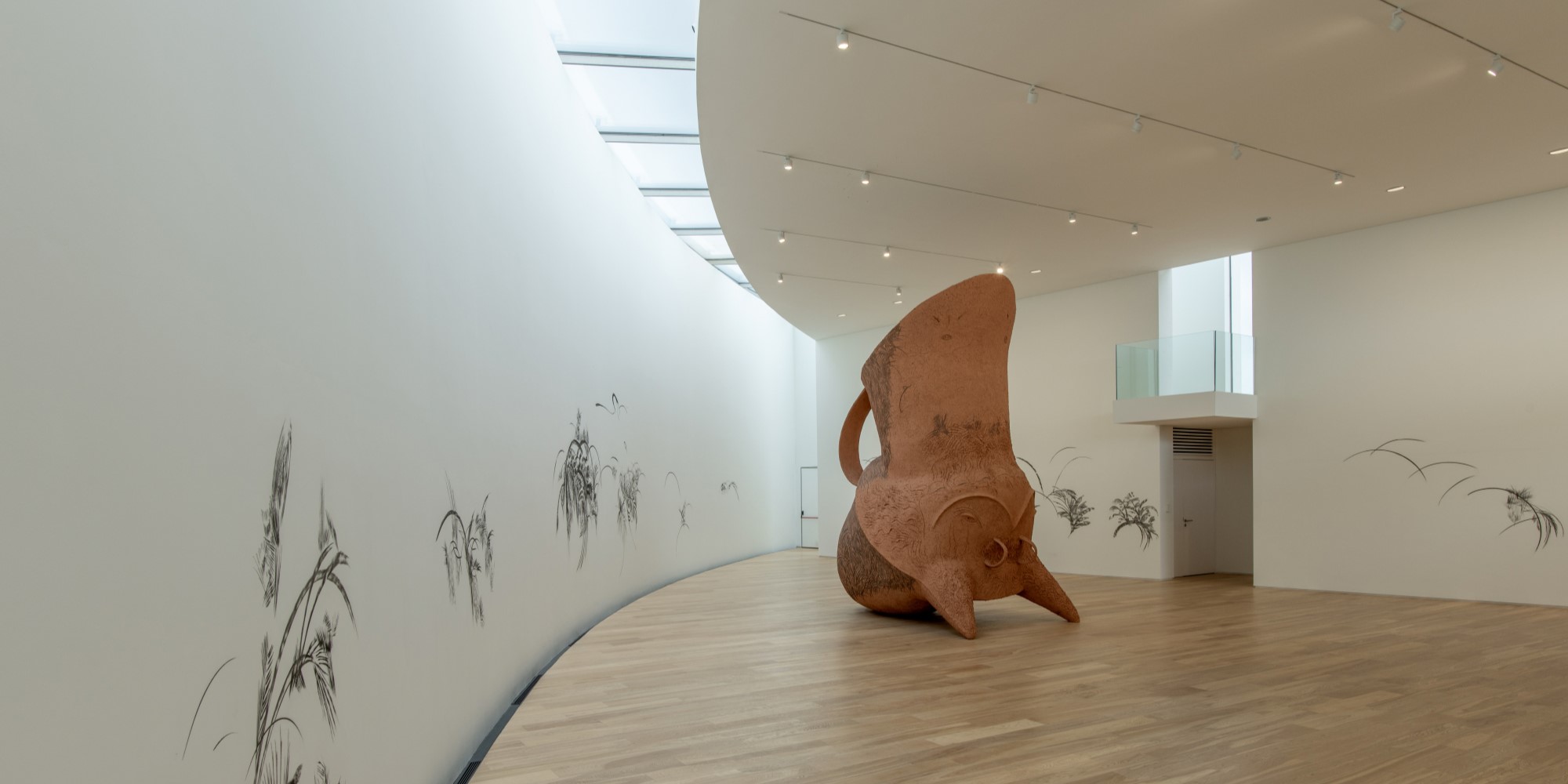 The interior of the building is made up of a large double-height main space under a perimeter skylight that floods the interior with natural light. Ancillary spaces occupy the east of the plan and stairs run along the north connecting the main gallery on the ground floor to a secondary gallery in the basement and an events terrace dominated by views and plantings on the roof. The building’s post-tensioned concrete floor slabs allow enormous spans and highly flexible gallery configurations. White plaster and natural wood finishes provide a neutral backdrop for the artwork displayed within.