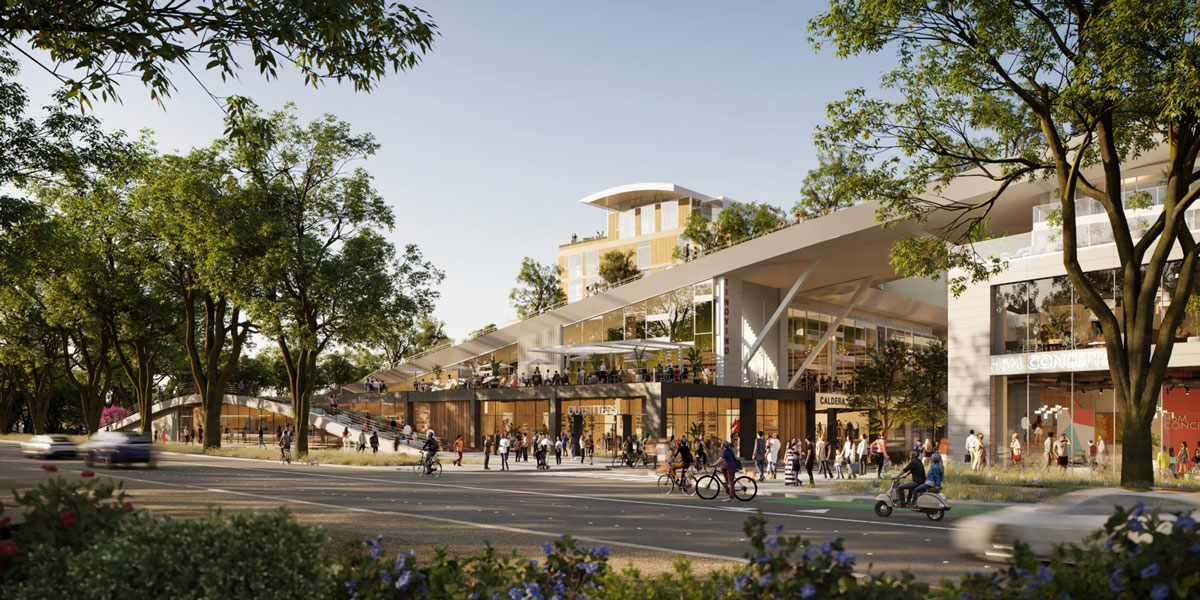 The project was driven by several overarching objectives, including clearing an existing mall, a bridged superblock; integrating the site by breaking it down into pedestrian-friendly blocks; creating a civic icon, and introducing a dynamic mixed-use environment for neighbors and visitors. The ground level blocks contain a variety of retail, restaurant, and entertainment amenities that face the street and surround multi-story integrated parking garages at the centers of the blocks. An undulating roof above reduces the apparent massing of the development.