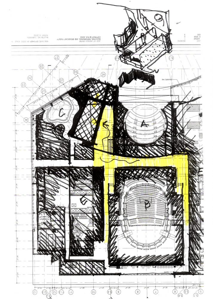 Uniquely immersive spaces for jazz performance reflect the interactive spirit of the most American art form and herald its presence from a monumental window along the axis of 59th Street in Manhattan.