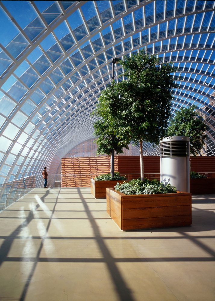 Commonwealth Plaza is conceived as a sheltered extension of the sidewalk and encourages the fabric of the city to flow into the complex where cafés, free performances, dramatic design, and people who visit combine to create a dynamic civic experience.