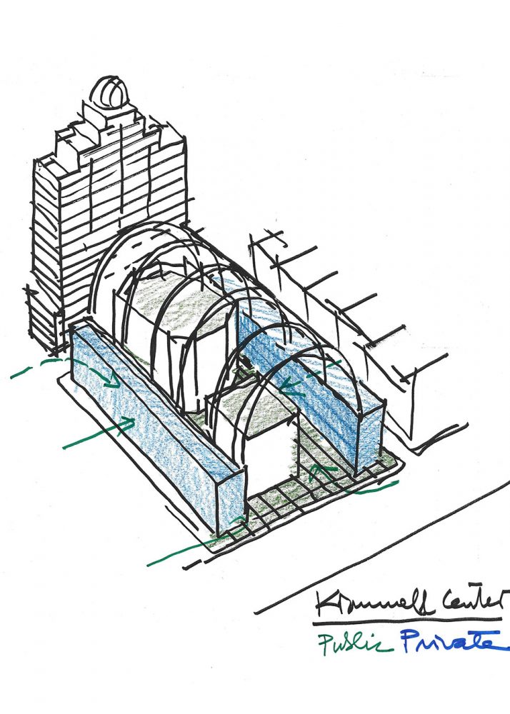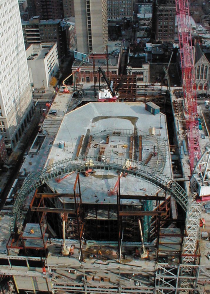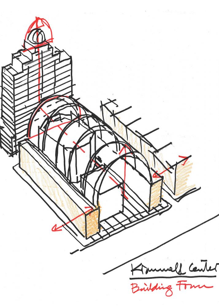 For the Kimmel Center for the Performing Arts, Rafael Viñoly Architects was tasked with providing a state-of-the-art home for the Philadelphia Orchestra, a flexible theater for multiple types of performances, and a major new public space for the city of Philadelphia on a single site. Located along the Avenue of the Arts cultural corridor on Broad Street, the Kimmel Center also furthers the revitalization of this primary north–south axis in the downtown area. Chosen after developing 13 alternative schemes that explored variations in the placement of halls, lobbies, and event spaces, the design treats the main program components as freestanding buildings on a vast indoor space, Commonwealth Plaza, enclosed by a brick, steel, and concrete perimeter building and topped by a large steel-and-glass barrel vault roof that fills the interior with natural light.