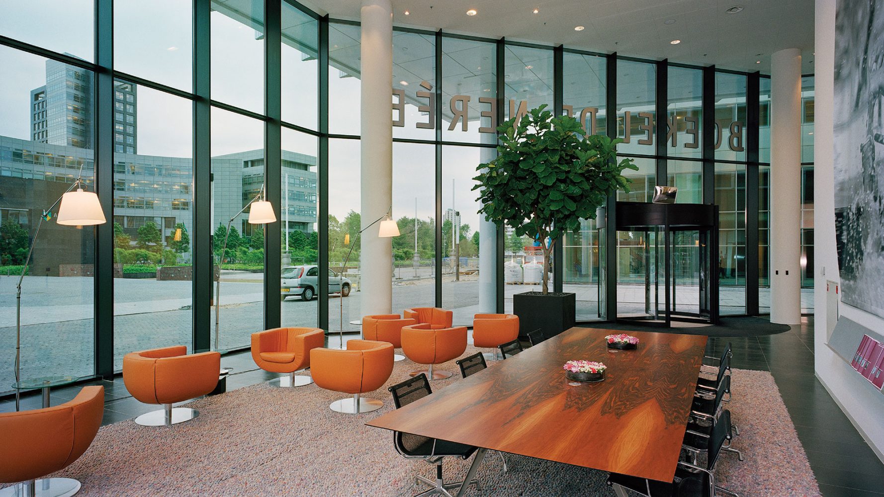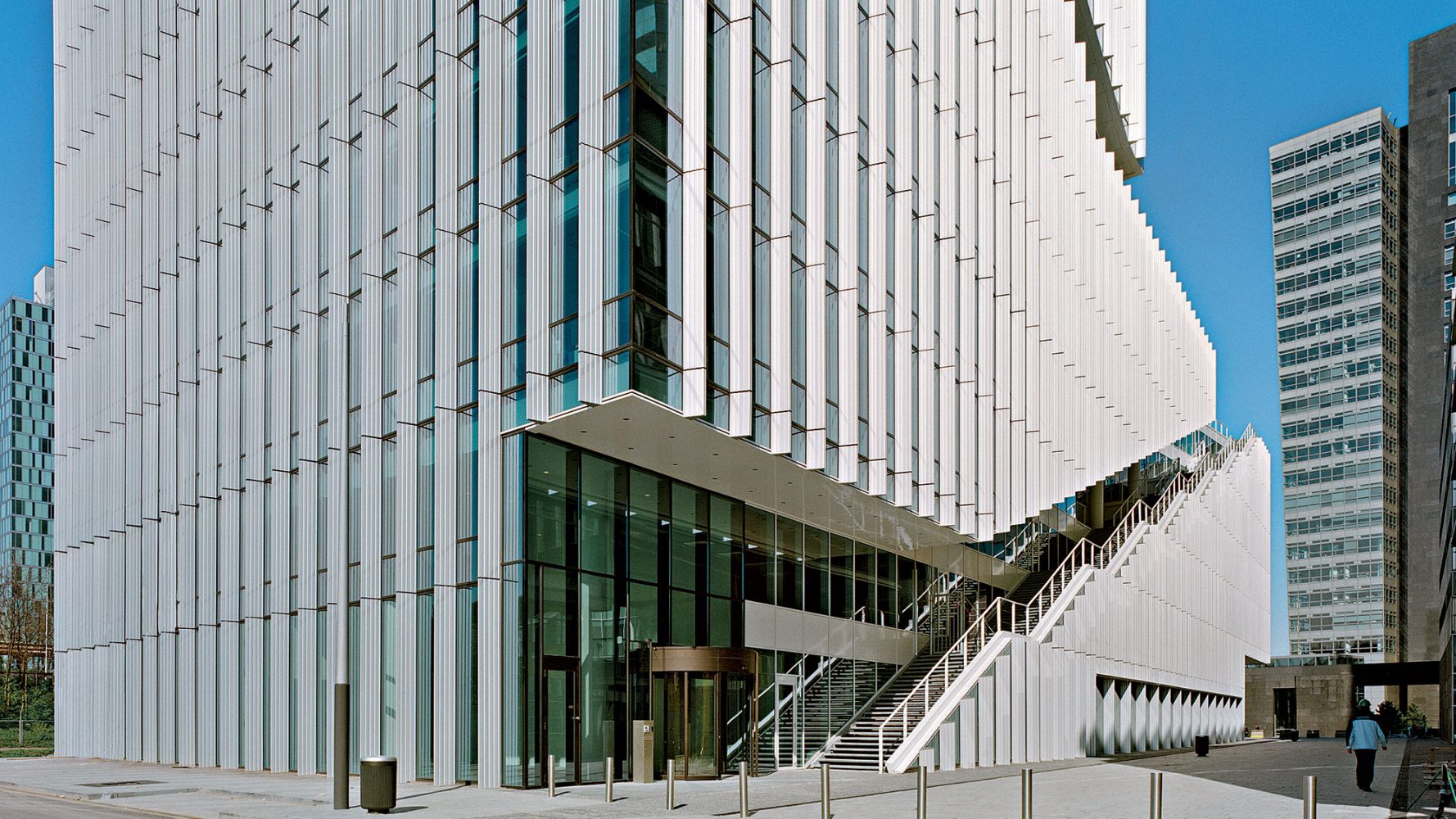 Furthering a sense of unified mass, the building is clad from top to bottom with glass and clear anodized aluminum fins—materials with subdued reflective qualities that respond to even the subtlest atmospheric changes in Dutch weather. As visitors move around the building, the spacing of the vertical mullions appears to vary in density, yielding a dynamic, constantly changing image. The combined effect of the external staircase and the dynamic building skin encourages perception of the building not as a composition of stacked planes but as a single sculptural element in constant motion.
