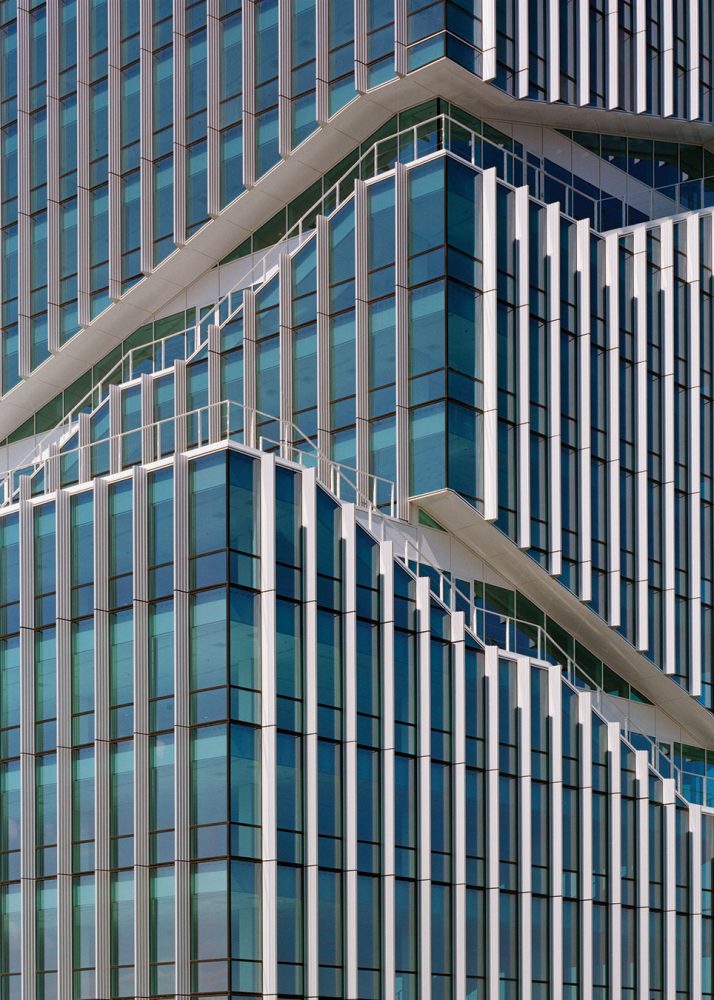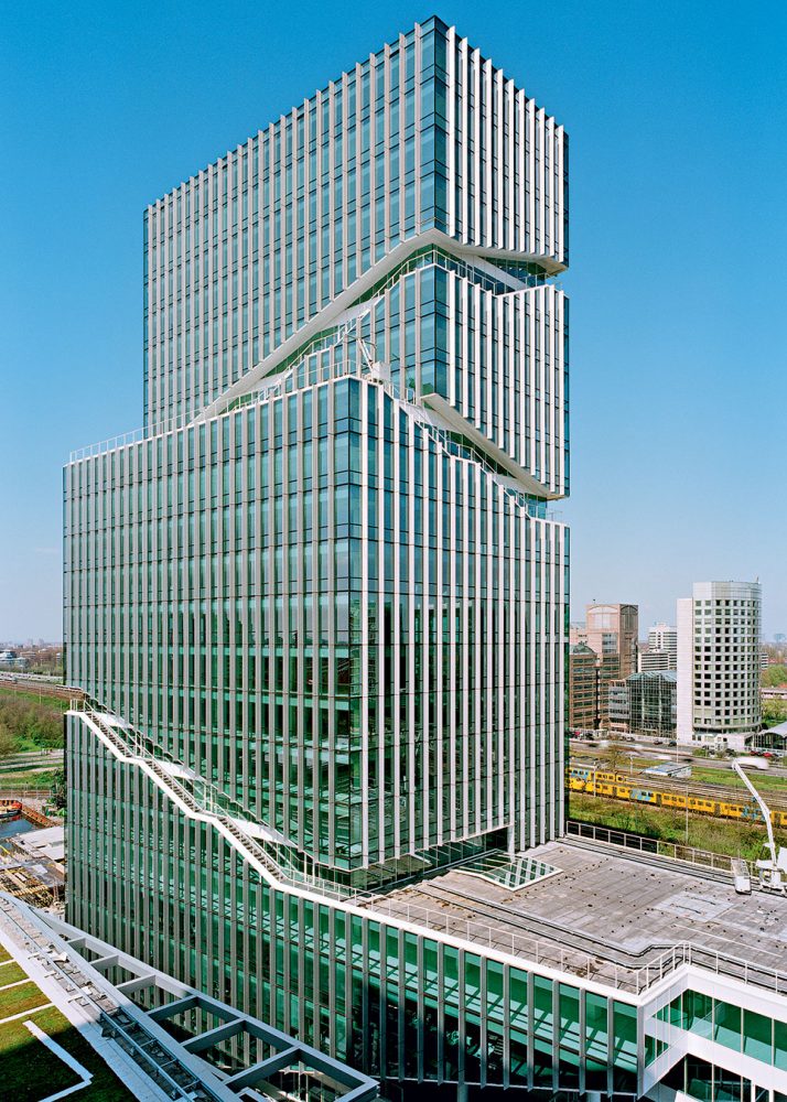 The Mahler 4 Office Tower is located in a 160,000-square-meter (1,722,225-square-foot) mixed-use development in Amsterdam’s Zuidas district, an ambitious urban regeneration project located approximately halfway between the city center and Schiphol Airport. The master plan mandated a specific zoning envelope for each building in the development, resulting in the traditional base, shaft, and crown structure of high-rise buildings, here angled in plan to yield a more dynamic urban composition. Rafael Viñoly Architects’ design sought to reinvent this tripartite building structure, unifying the three tower volumes into a singular, dynamic composition through the use of an exterior stair and vertical aluminum mullions.