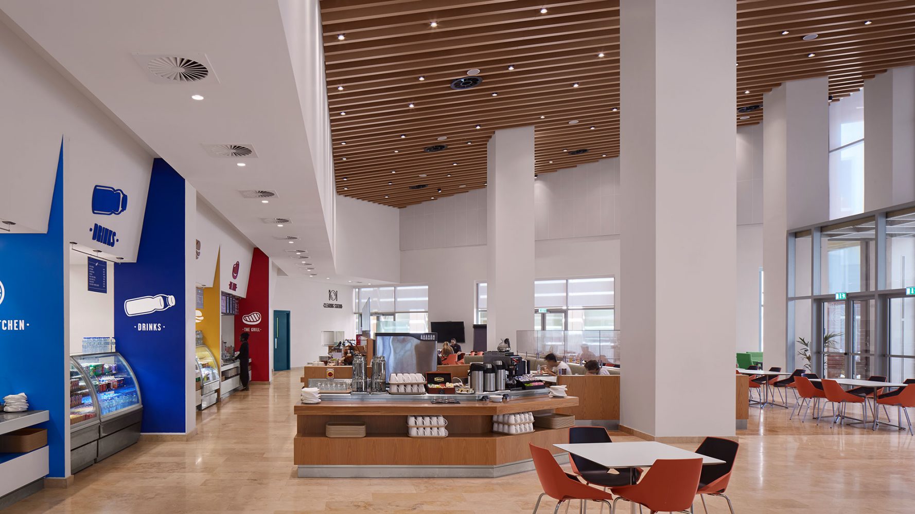 Esta Universidad se planificó desde cero en el contexto de un ambicioso plan urbanístico. Como tal, el proyecto poseía un contexto arquitectónico local limitado con el que dialogar, pero tenía el objetivo de crear un entorno compacto y cómodo para los peatones que estimulara conexiones multidisciplinarias y, al mismo tiempo, se adaptara al clima desértico. El resultado es un campus de dos niveles con calles angostas y una agrupación y volumen de los edificios adaptados para recibir la proporción óptima de sombra y una disposición que aprovecha el viento para facilitar la ventilación natural. El diseño del paisaje urbano se integra en el entorno —con columnatas, vegetación autóctona, celosías y los tradicionales canales de agua— y la morfología urbana para crear un espacio exterior que es cómodo durante todo el año.