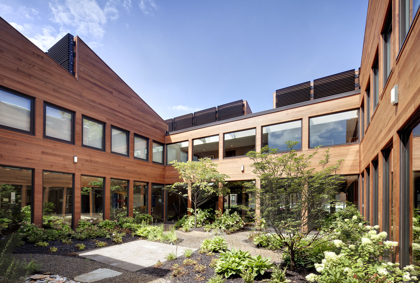 The building design seamlessly integrates the Transplant House within the surrounding 3-4 story residential neighborhood while also consisting of a subtly different volume. The courtyard functions as the central organizing feature of the design and is intended to create a prominent sense of place for patients and families alike. Guest bedrooms are organized around the courtyard, with each unit receiving a generous south-facing sloped roof to allow natural daylight directly into the room. All of the bedrooms are located on one level so that there is limited vertical circulation and a strong sense of connection among guests.