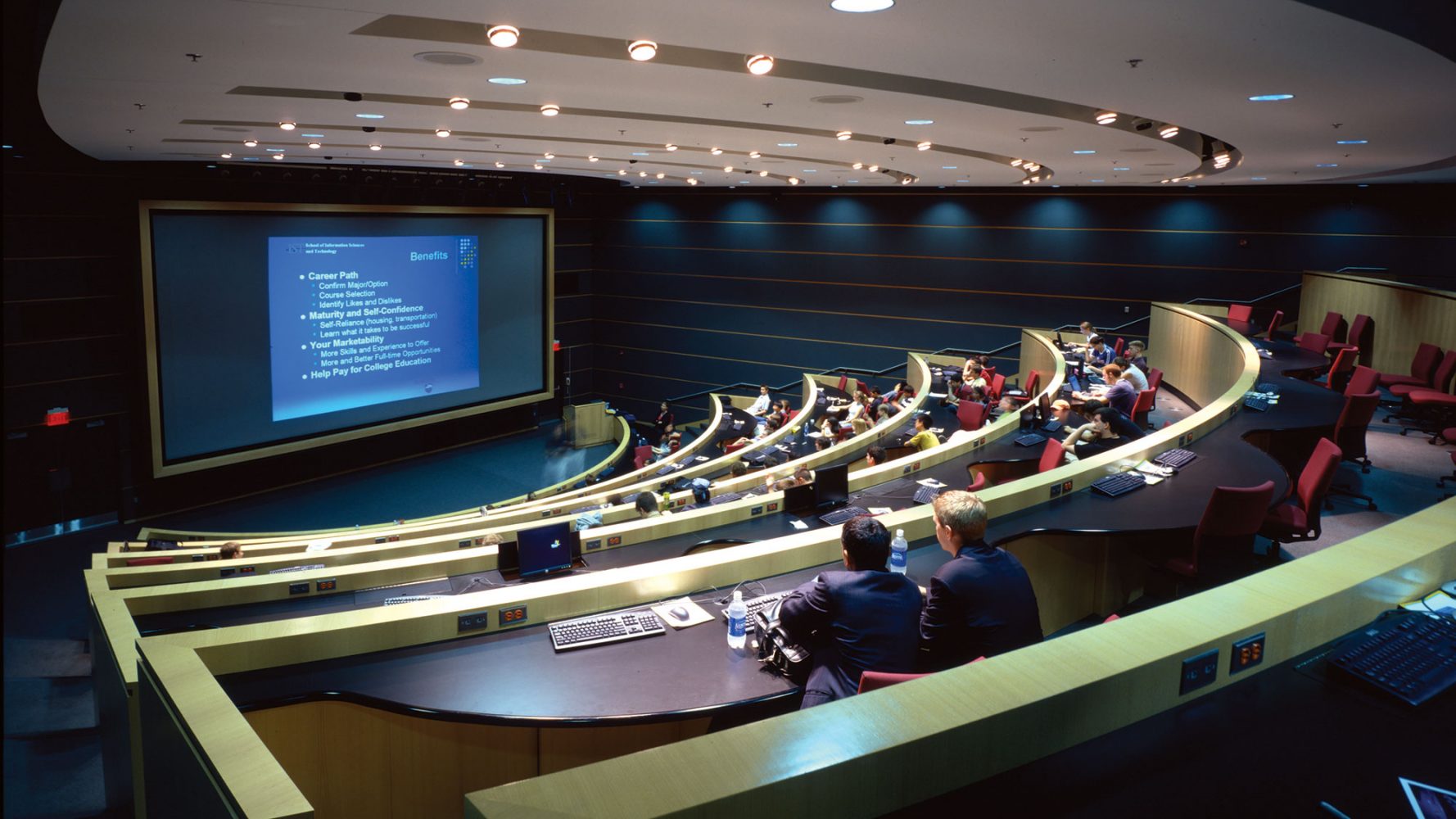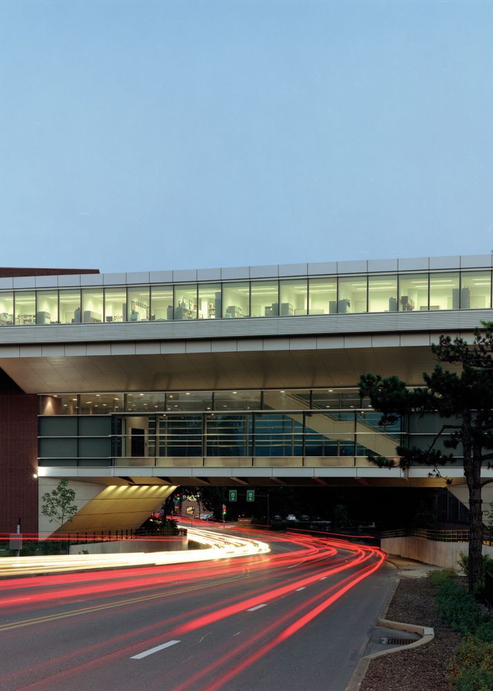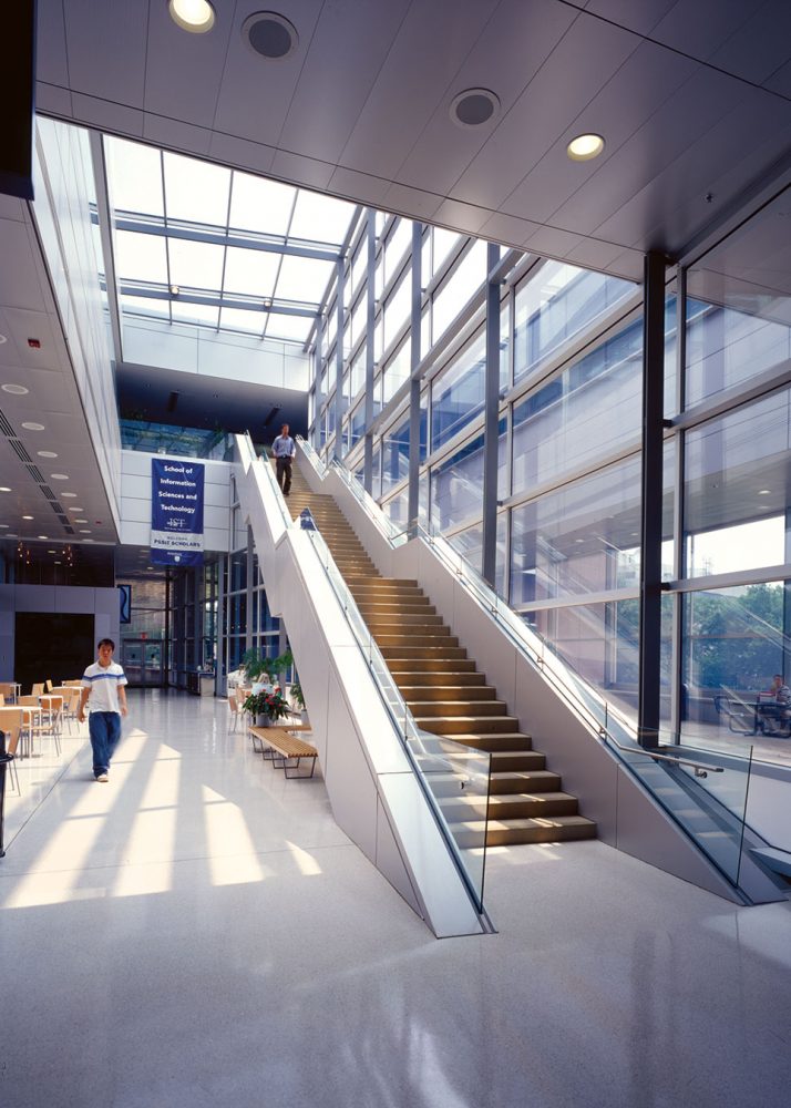 The design extends an important pedestrian artery in the campus and incorporates it into the architecture as a pedestrian and cyclists promenade that starts on a ramp at one end of the long structure, rises up and over the main thoroughfare and lands gently on the other side, also via a ramp. Distributed along this promenade are classrooms, administrative offices, and a high-technology auditorium known as the “Cybertorium.” At the span’s midpoint, a café provides a social and collaborative environment with open views of the wooded landscape of the campus. A second floor is suspended above the promenade and contains research facilities, including computer labs and faculty offices. This level accommodates all classrooms and computer labs with flexible floor plates. The elements come together to create a dynamic new home for 800 students and 80 faculty and staff members of the IST.