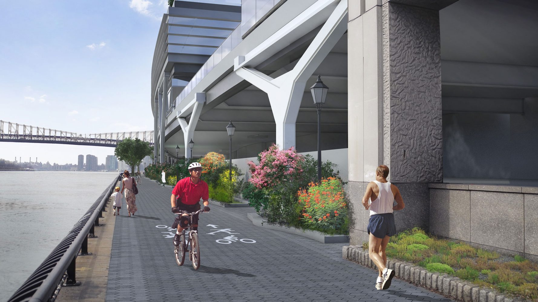 Los nuevos laboratorios, las instalaciones educativas y servicios del campus se disponen en un edificio horizontal que se extiende a modo de puente sobre la autovía FDR adyacente y amplía generosamente los emblemáticos jardines de la Universidad hasta la orilla del East River.