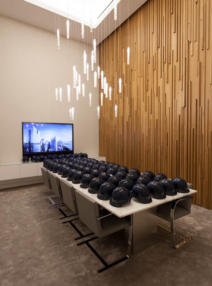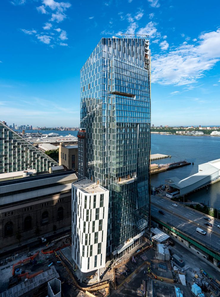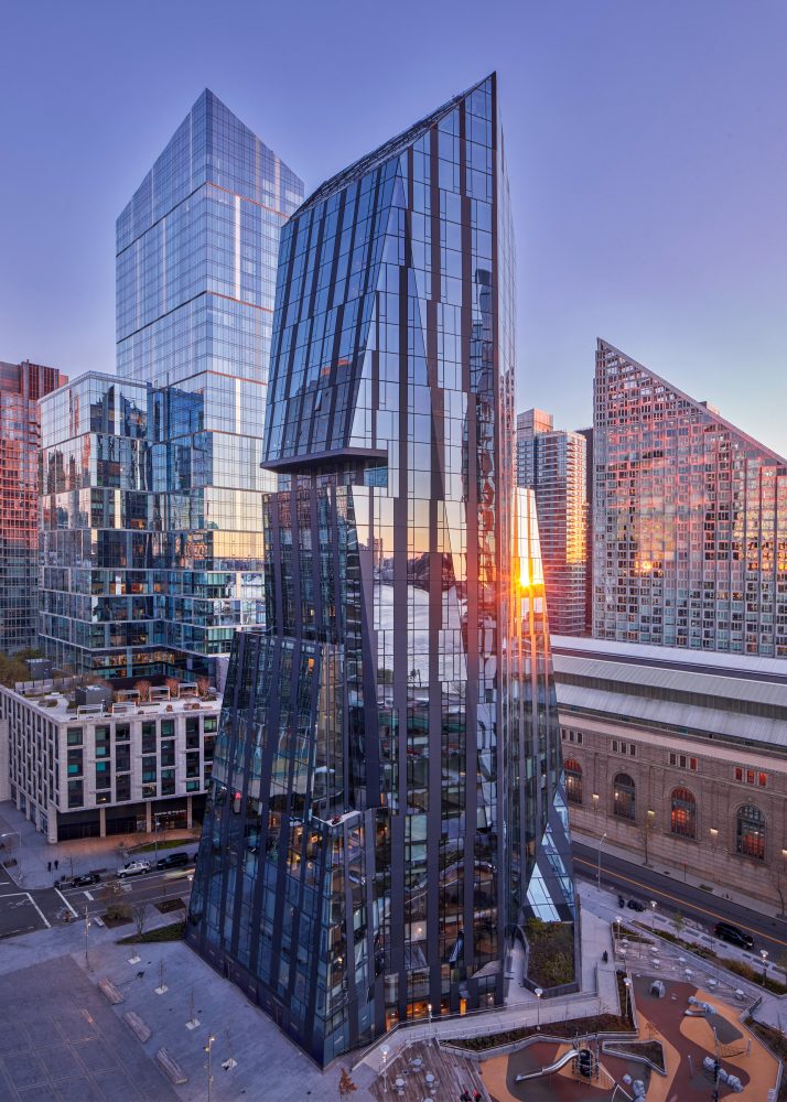 Each tower’s position and overall bulk were established as part of the redevelopment’s land use transformation and master plan. In compliance with the zoning envelope’s angular and offset planes that directly impacted the geometry of the individual buildings within the development, Three Waterline Square’s design creates a singular vertical object with a crystalline shape set in the landscape of glass towers along the Hudson River waterfront.