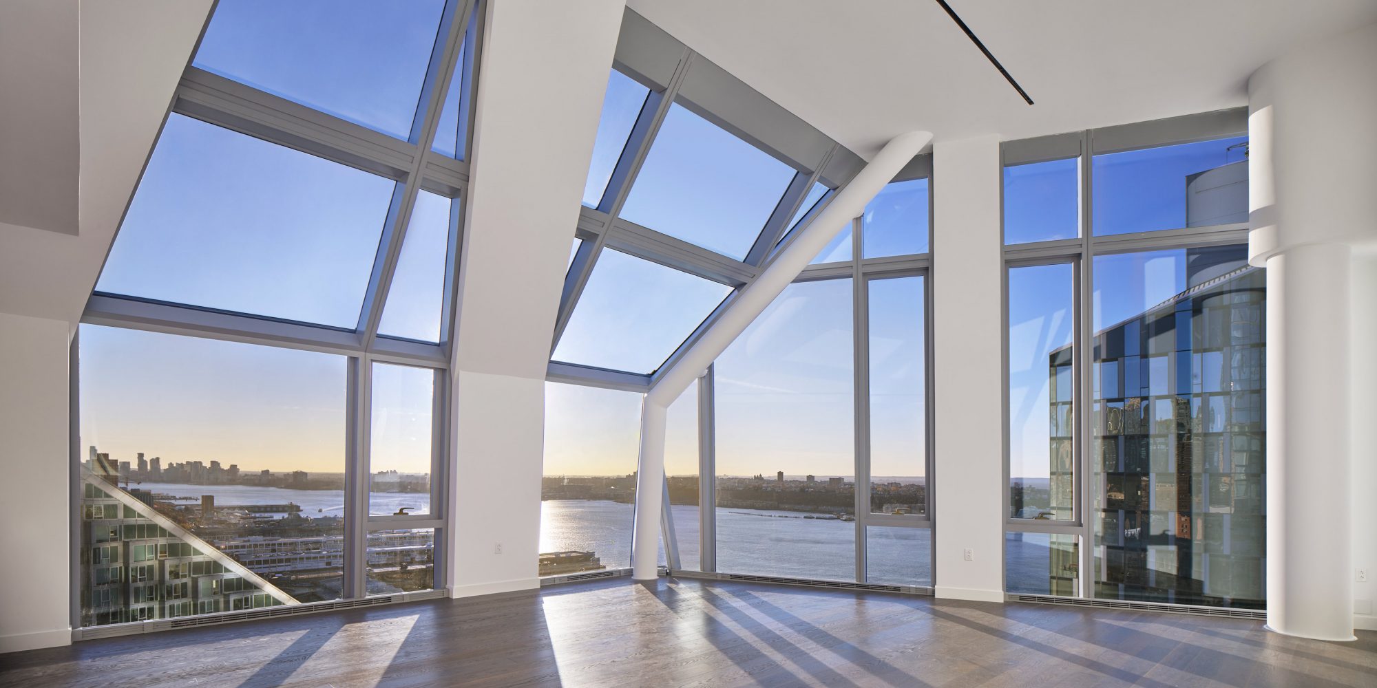 Seemingly random and varied patterning across multiple facets of angled glass accentuate the building, but this apparent randomness is the expression on the exterior facade of specific interior functions (living vs. sleeping vs. dining); the façade glazing and opaque panel arrangement is also driven by energy conservation and the framing of views of New York City and the Hudson River.