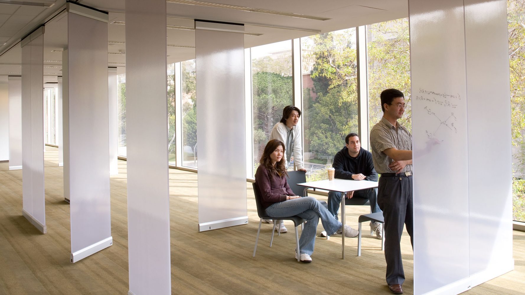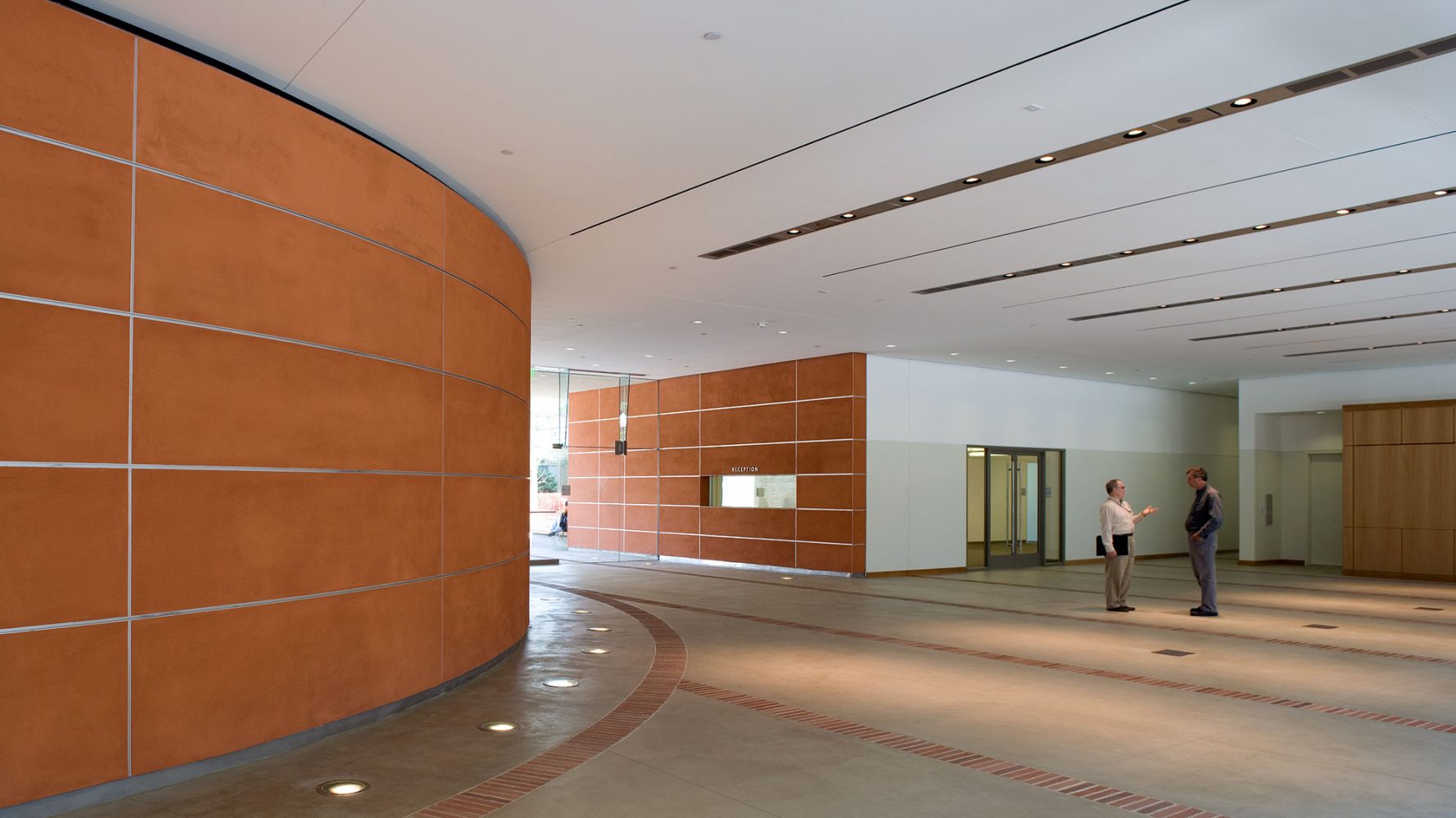 The open-air entrance lobby and courtyard provides a direct connection to UCLA’s Court of Sciences. The lobby connects through a network of bridges within the courtyard to research floors and to the garage, facilitating an atmosphere of communication. The center courtyard with bridges crisscrossing the space enlivens the courtyard buildings; on the interior, workstations overlooking the central space are personally controlled through low-level ambient and task lighting, and acoustic buffer areas create interior quiet zones.