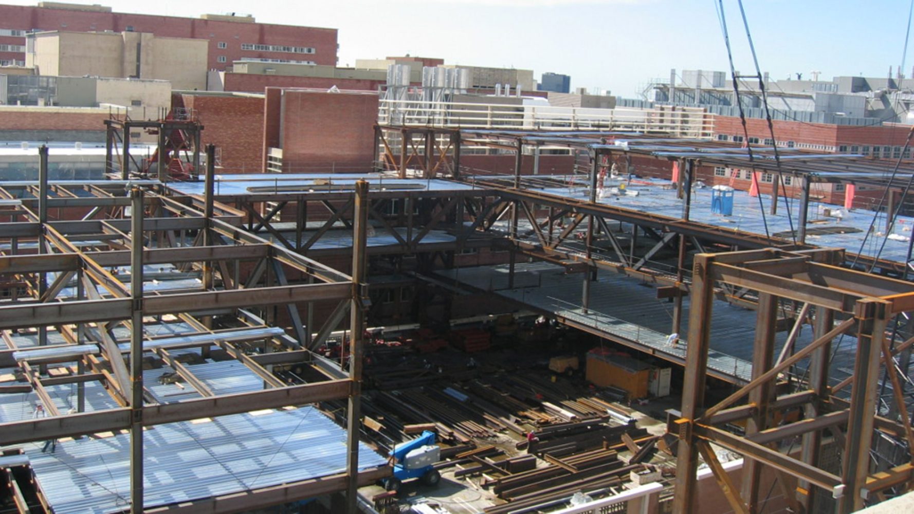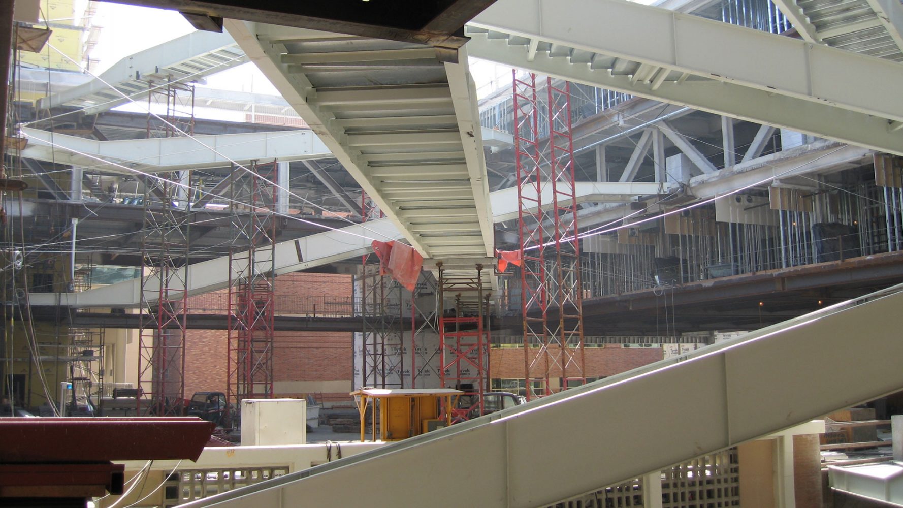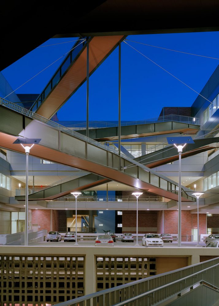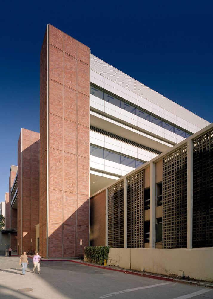 Building three floors over part of the parking facility maximized the building’s potential and opened new possibilities for laboratories and common areas. The result was a seven-story building partially below grade with a central courtyard intersected by suspended bridges and stairs, and a main entrance facing the other structures on the Court of Sciences. The courtyard is UCLA’s predominant campus building form.