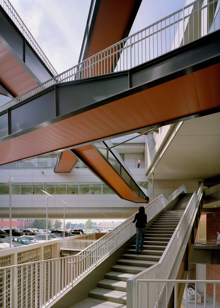 According to the original brief, the adjacent parking garage was an obstacle that dictated a multi-story tower with small floor plates on one side of it. Instead, Rafael Viñoly Architects saw the garage as the starting point for the design and proposed a horizontal configuration suspended over it to foster student and researcher collaboration and to open up new possibilities for the rest of the campus plan.