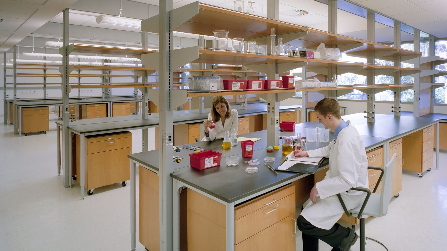 Offices on the sixth floor border the courtyard and connect directly to the larger-area laboratories via open-air pedestrian bridges, spurring greater interaction among building users. Six floor plates housing open laboratories sit suspended above. These laboratories along the structure’s perimeter are open-plan and can be easily reconfigured, acknowledging the ever-changing nature of advanced scientific research.