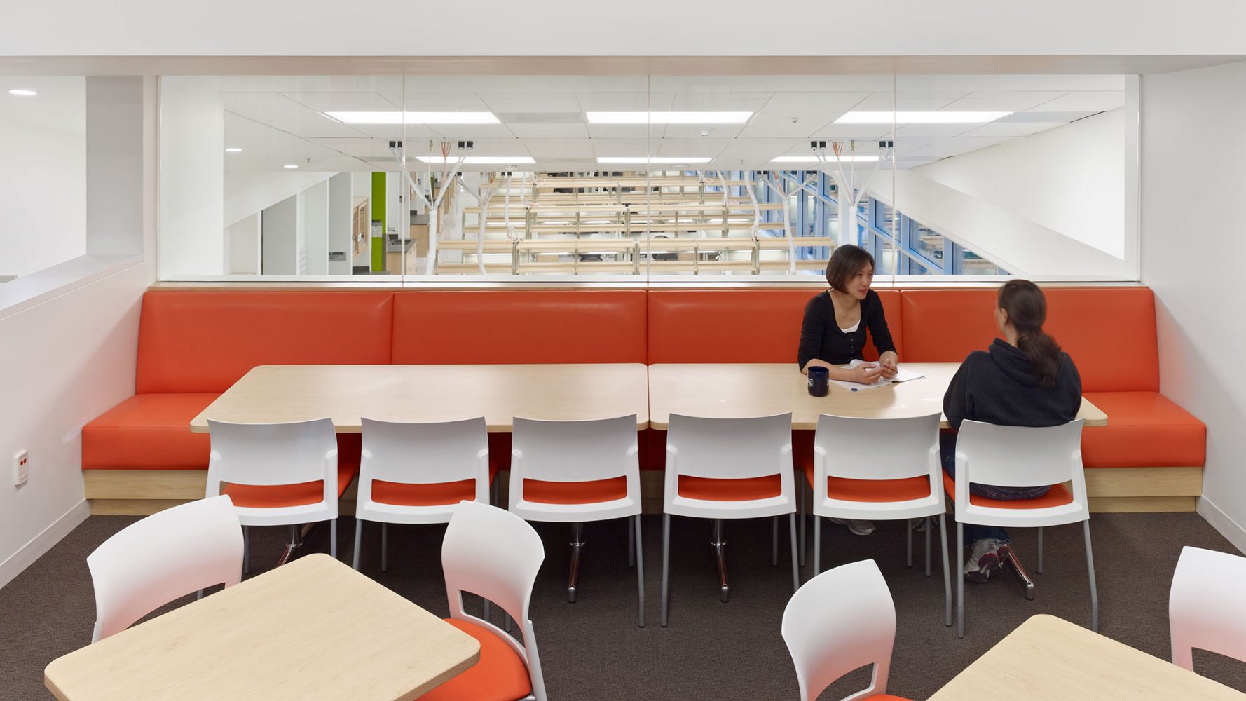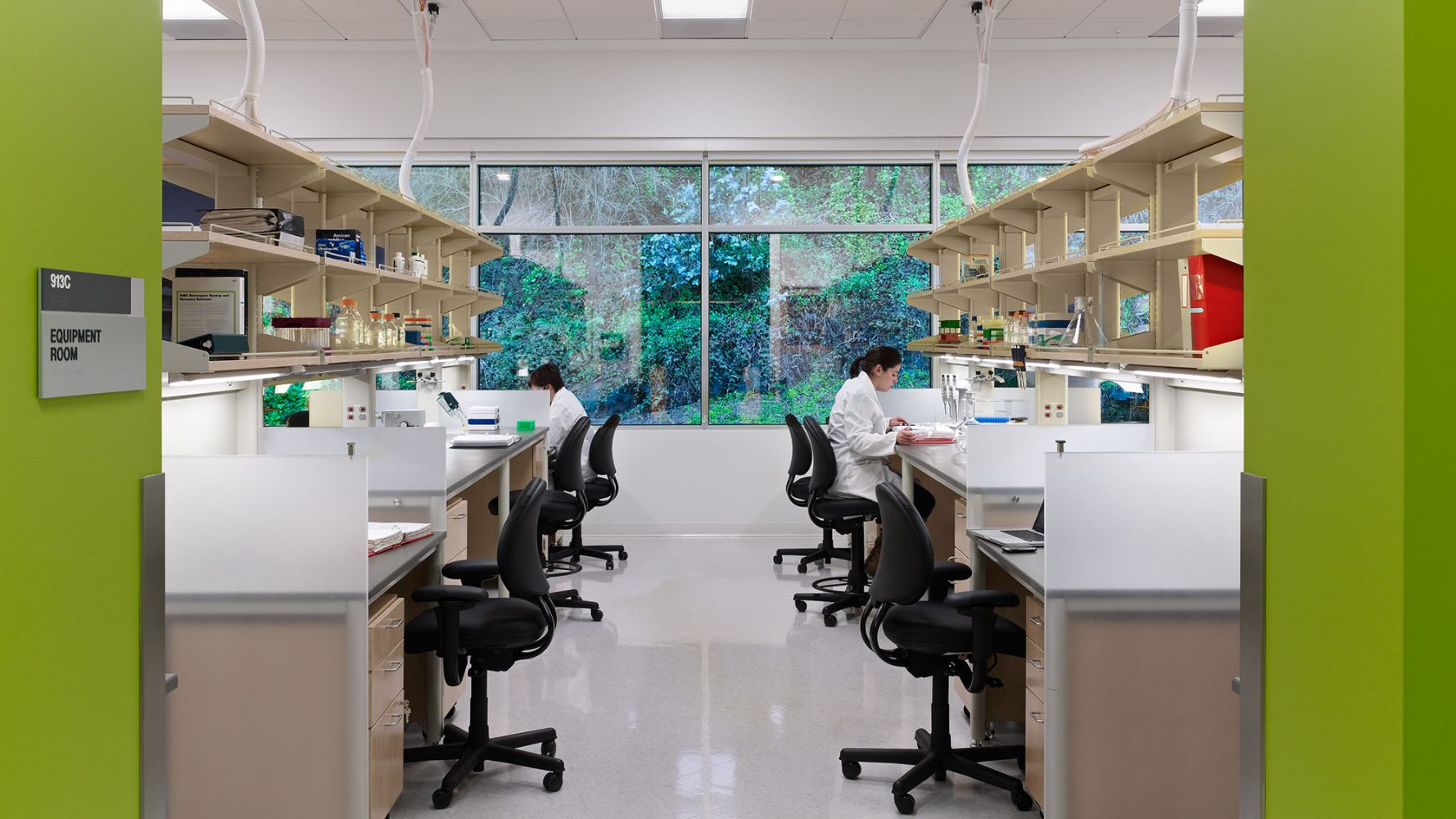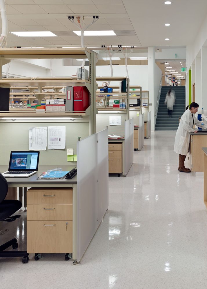 Inside the building, the transitions between the split levels are designed as hubs of activity. Break rooms and stairs located at these interfaces increase the potential for chance interaction, and interior glazing maximizes visual connectivity between the lower labs and the upper offices. To further promote collaboration, the laboratories occupy a horizontal open-floor plan, with a flexible, custom-designed casework system that enables the rapid reconfiguration of the research program. Abundant south-facing glazing fills the open laboratories and offices with natural light and views of the wooded slope of Mount Sutro nearby.