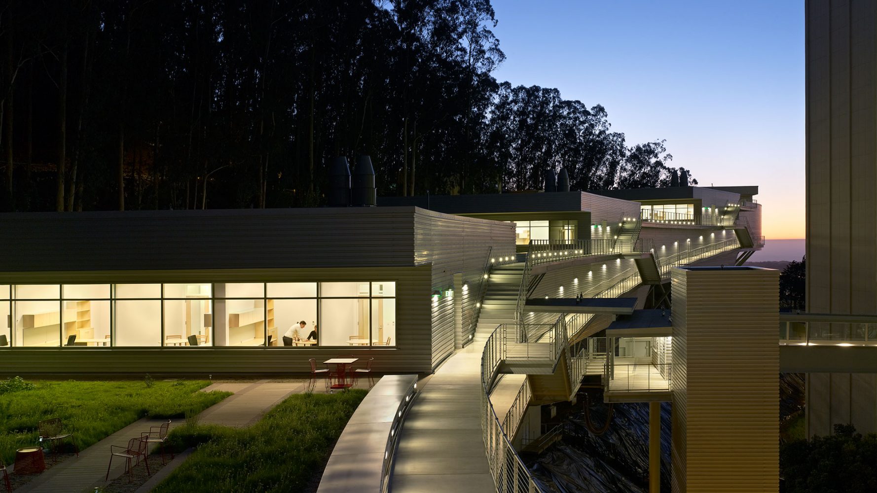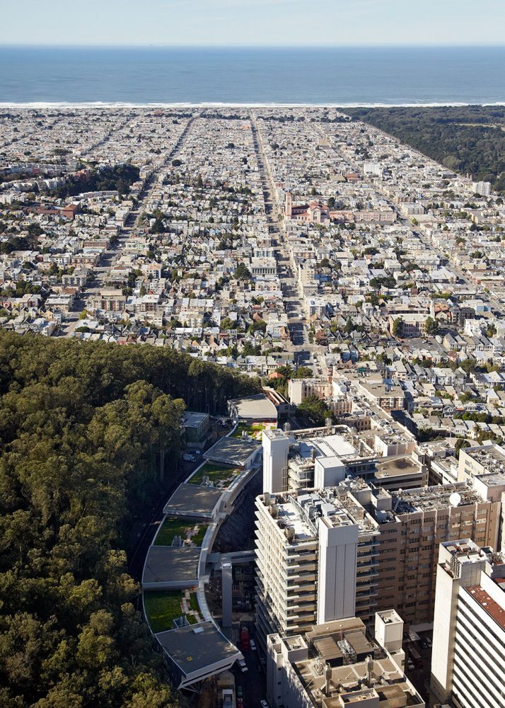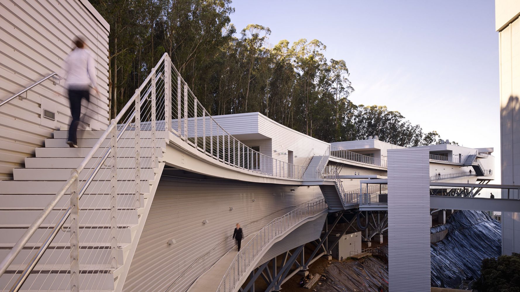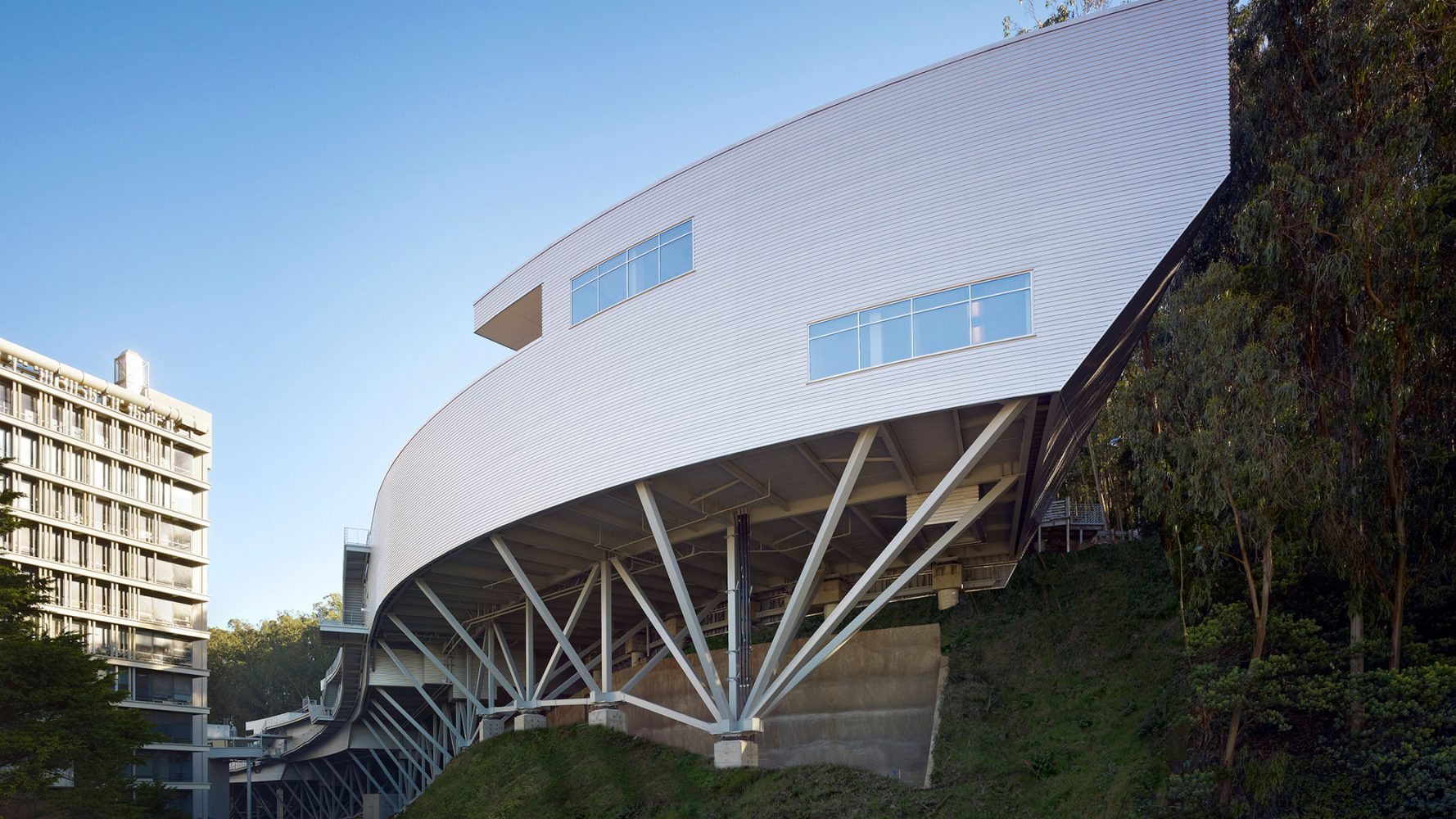 Given that the building was to be located on a steeply sloped site at the foot of Mount Sutro, the client expected a vertically organized structure, which could have led to the creation of a series of small, stacked floor plates that might not have been well-suited to the institute’s research needs. Based on the firm’s experienced precedent that a horizontal scheme is best for interior lab organization and for research collaboration, Rafael Viñoly Architects found a way to plan a horizontal building despite the challenging site. Four split-level floor plates step down a half-story as the building descends the forested mountain slope, allowing the main floor to function as one continuous laboratory. Each half-story step is topped by an office cluster and a green roof. Exterior ramps and stairs take advantage of the temperate climate to provide continuous circulation between all levels. The facility connects to three nearby research and medical buildings–Medical Sciences, Health Sciences West, and Health Sciences East–via a pedestrian bridge. The building structure is supported by space trusses on concrete piers, minimizing site excavation and allowing for the incorporation of seismic base isolation to absorb earthquake forces.