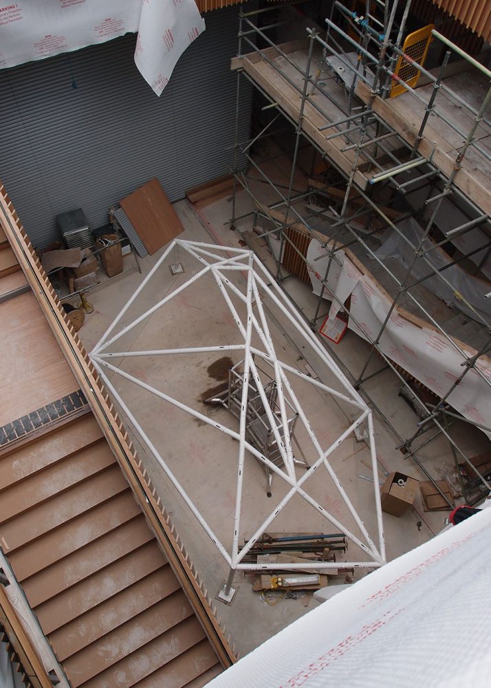 地下的夹层是一个集中的教学空间。演讲厅,教师和讲座室围绕一个用作非正式学习以及社交的巨大开敞空间布置。自然采光从中庭通过两个代表数学程式的水晶状进光孔结构进入此夹层空间。