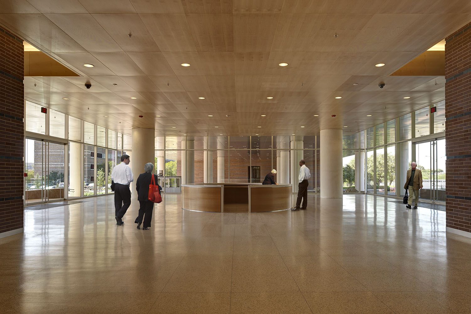 The facility consists of one large, horizontal floor for the contiguous arrangement of six different research programs, facilitating interaction among researchers. Elevators in four small lobbies at ground level provide access to the second-floor laboratory level, where clusters of faculty offices alternate in the building plan with five lab clusters. A corridor with support spaces on either side passes through the center of the building and connects the laboratories, while an open-plan design allows natural lighting to permeate the lab areas along the building perimeter. The third floor has additional faculty and staff offices, and conference rooms.