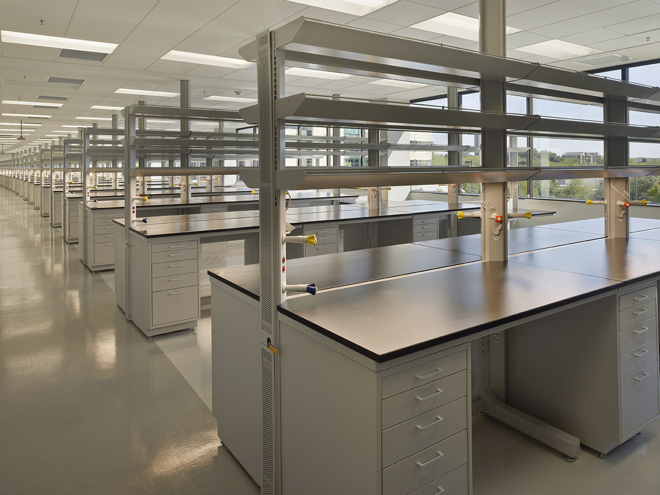 The laboratories are outfitted with modular casework custom-designed by Rafael Viñoly Architects. With adjustable-height work surfaces and vertical poles that connect to gas and other utilities in the ceiling, the lab casework enables quick and easy reconfiguration as research needs change.
