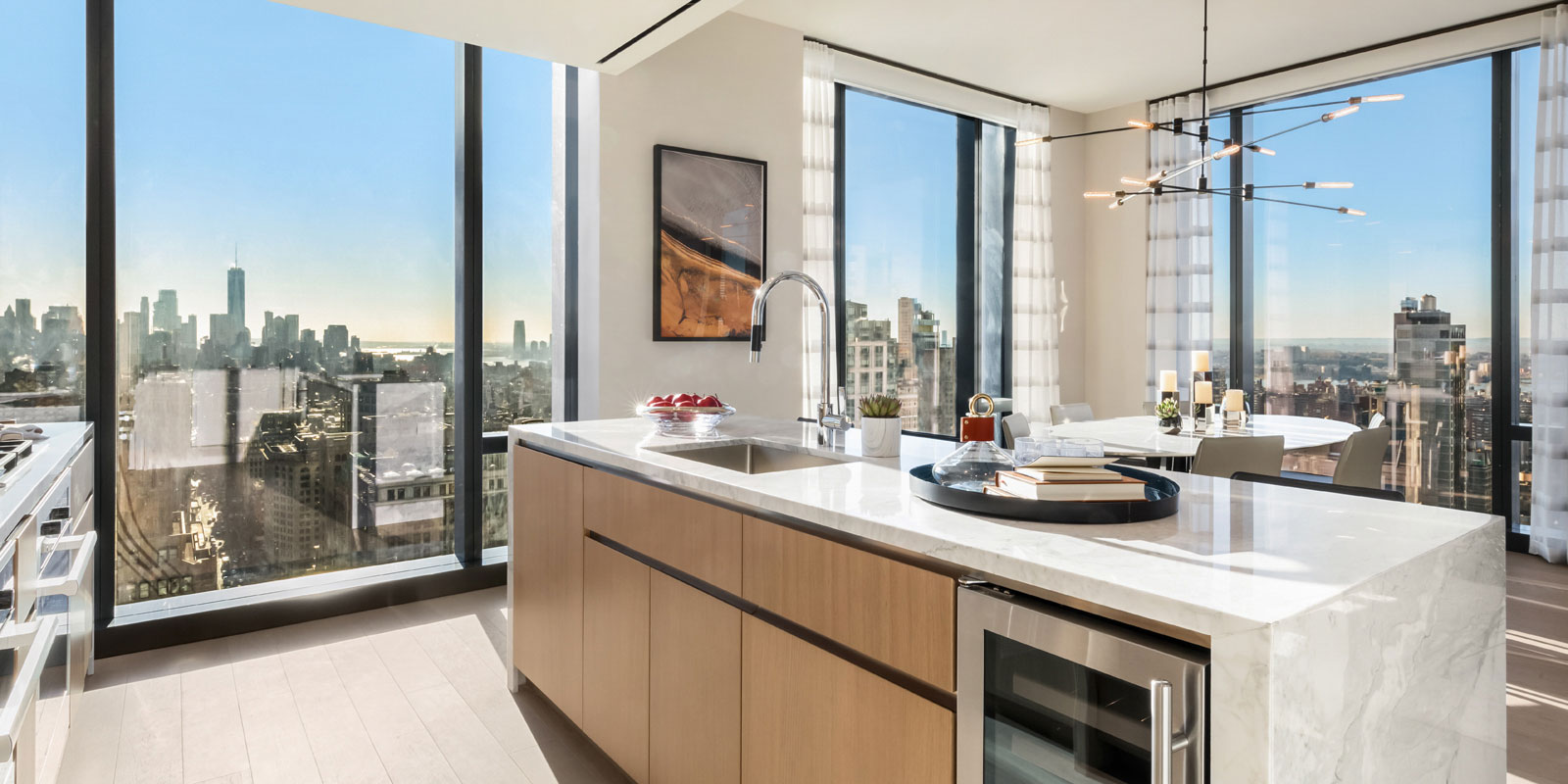 The tower’s modern architecture pays homage to nearby New York City signature towers, such as the Empire State Building, and other high rises from the late 1930s and early 1940s, respecting their verticality without imitating their interiors. Many natural stone and wood materials were incorporated into the interior design, such as marble, travertine, walnut, and oak, for the kitchen cabinets, countertops, and flooring.
