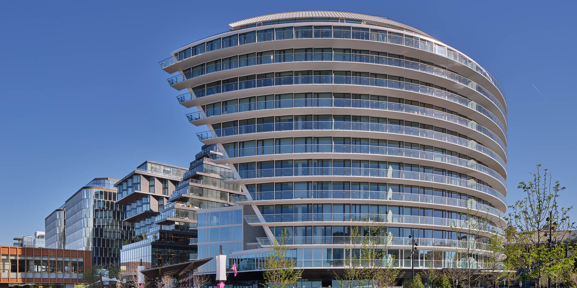 Forming a terminus to a row of buildings in The Wharf development of Washington D.C., the Amaris is a mixed-use residential building designed by Rafael Viñoly Architects with a unique form that maximizes views, allows daylight deep within each residential unit, and creates a recognizable and distinctive form along the Potomac River waterfront. The building overlooks the new M Street Landing Park, The Amaris’ new central public space.