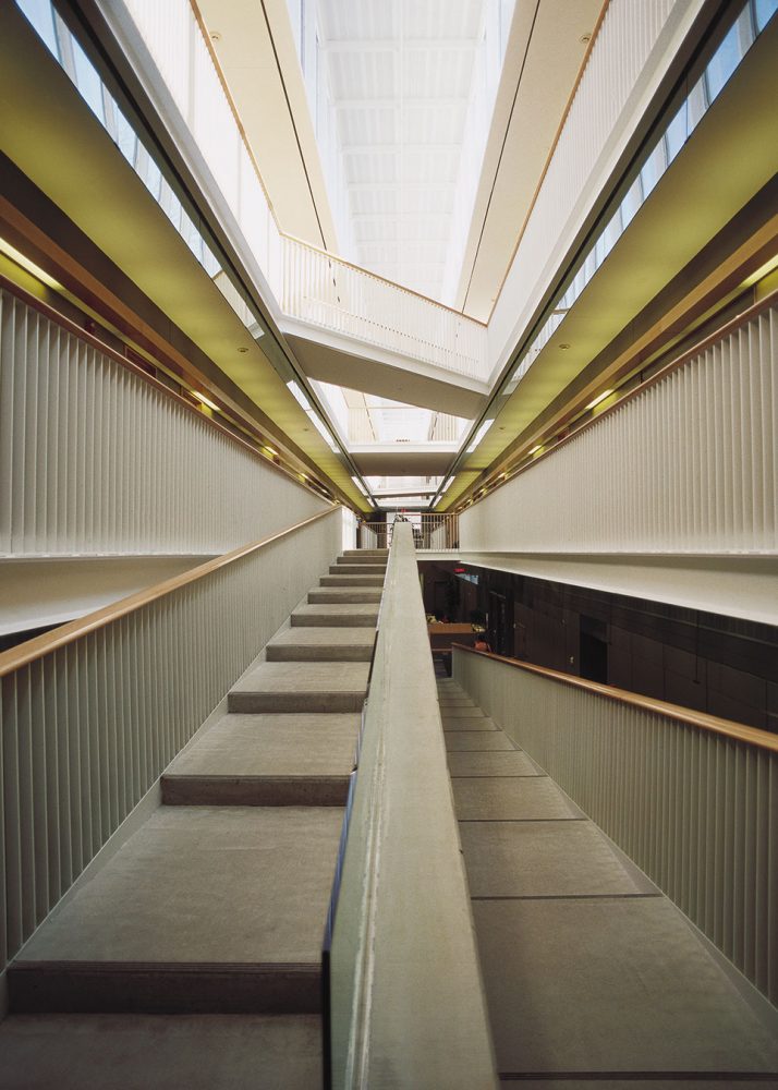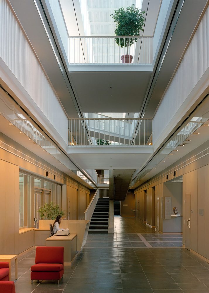 一个三层的几乎贯穿整个街区的中庭组织了为学生,教师,访问学者和政策制定者服务的各种功能,连接所有空间,包括一个藏书丰富的图书馆,教室和会议空间。自然光线通过玻璃沐浴到整个中庭。