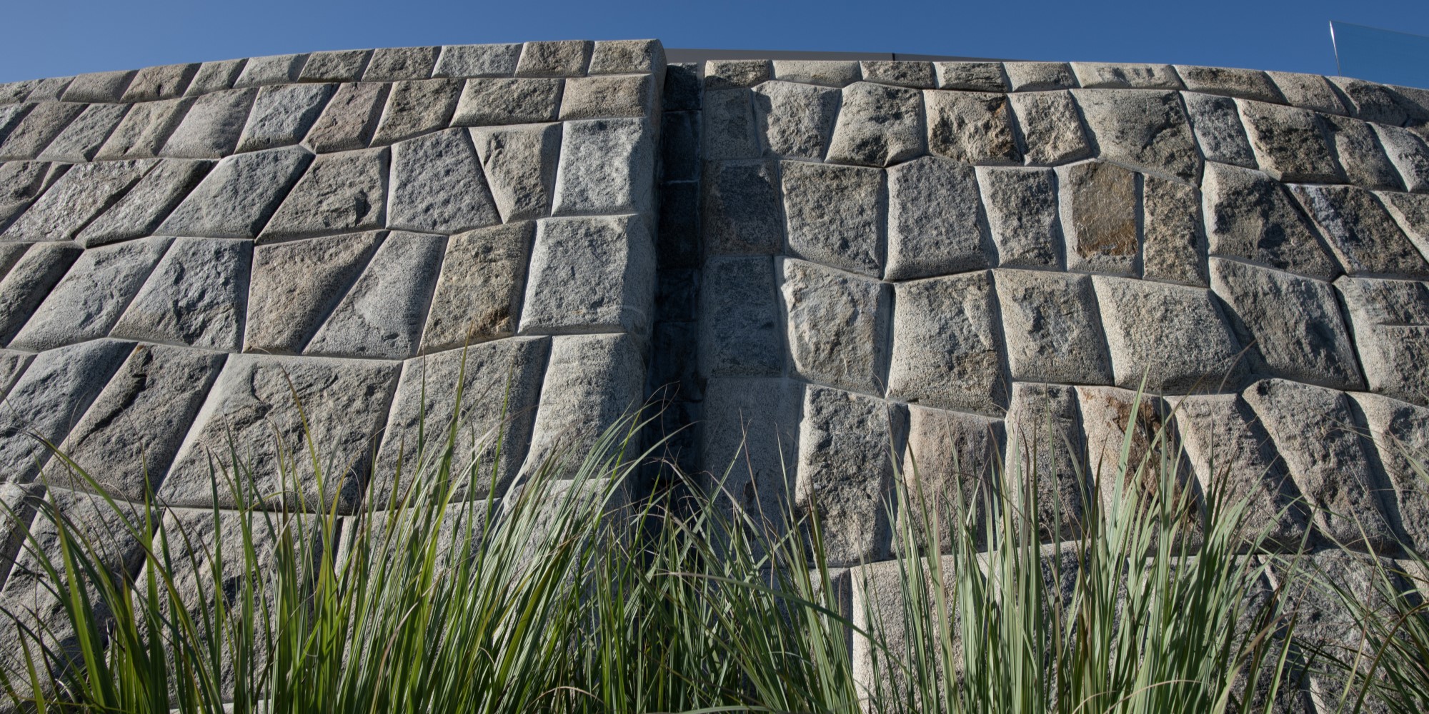The project follows the asymmetrical shape of its site, a right triangle whose hypotenuse is distended in an arc some 50 meters in length. The building follows that precise shape, with the minimum allowable set back from the lot lines to generate the largest possible internal area and allowing a wide variety of pedestrian perspectives toward its sculptural form. Its two-story exterior is defined by a simple white wall to the north, a mostly glass façade to the east, where the main entrance is located behind a 6-meter-high monumental Corten steel pivot door, and to the south, a large wall of monumental granite blocks hewn with the traditional method of the Incas. Being the main façade of the project, this curved, slightly inclined and monolithic element presents a quasi-geological shape that over time will assume an increasingly naturalistic patina.