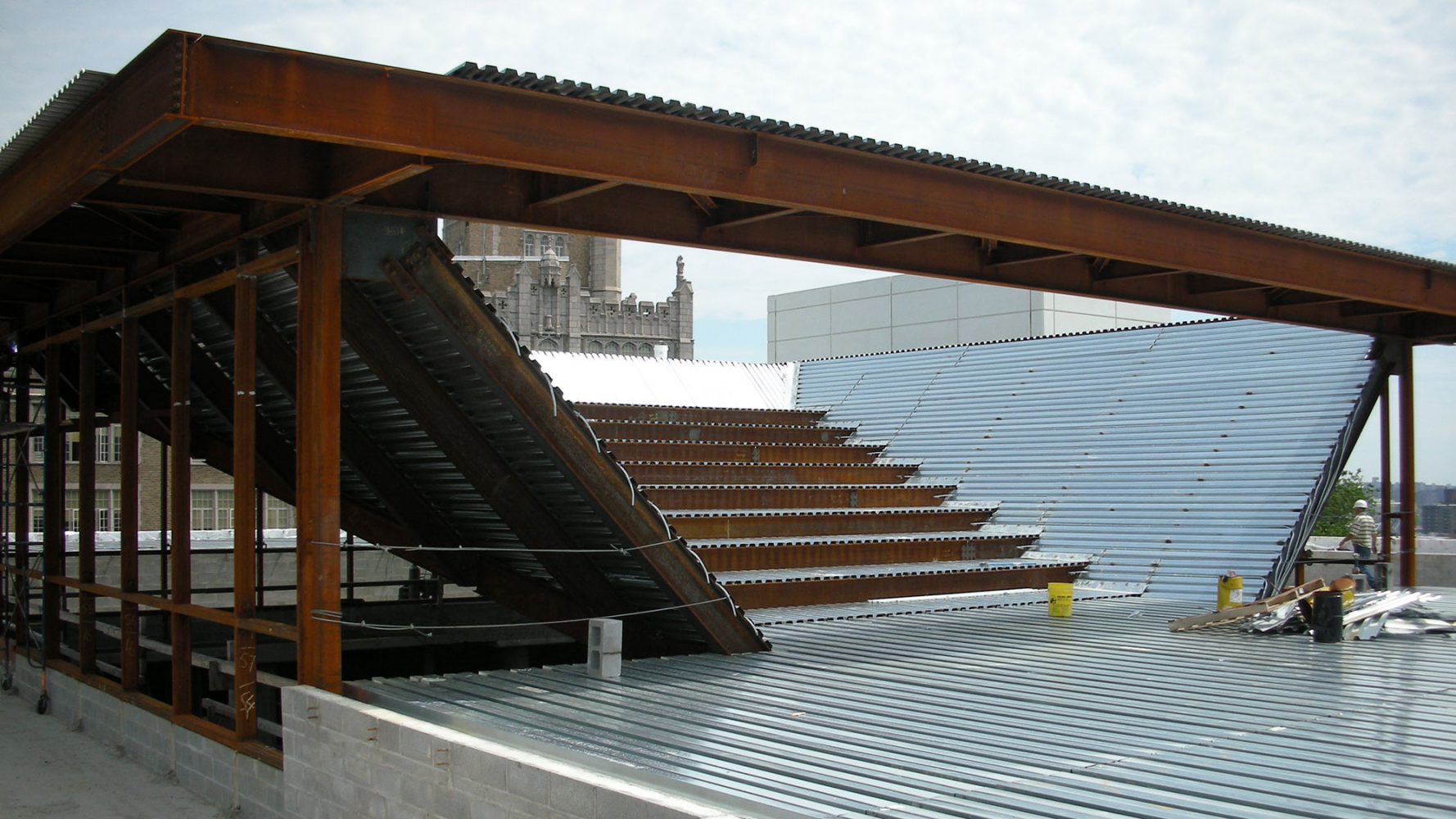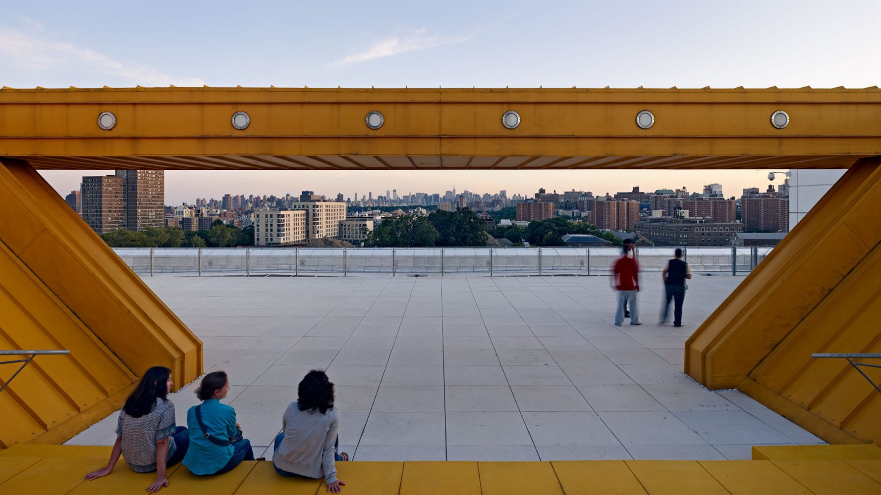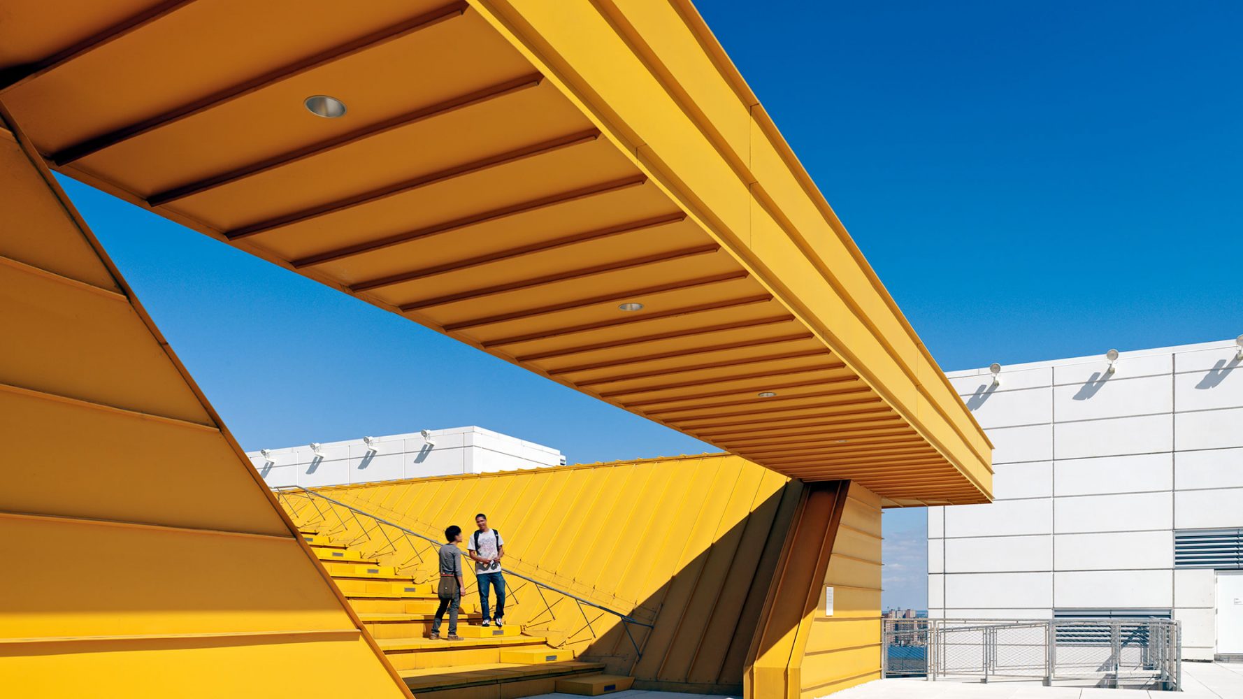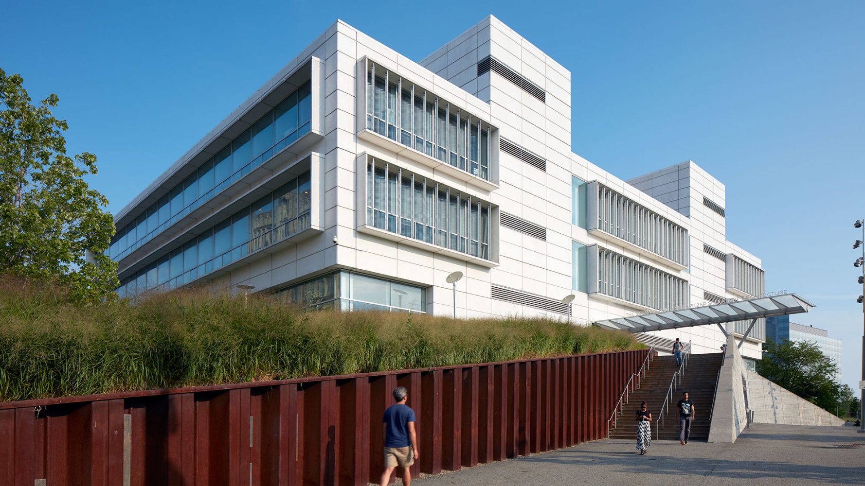 The exterior is clad in precast concrete with deep, shelf-like openings into which are set aluminum sun-shading louvers. Oriented vertically on the east and west façades, and horizontally on the south façade, the louvers are situated to balance outward views with maximum shading to reduce heat gain to the interiors. On the roof, an open-air amphitheater overhangs the atrium, with a full-height clerestory on three sides that admits natural light into the building. The amphitheater provides additional teaching and program space in temperate weather, and wide, unobstructed views of the midtown Manhattan skyline.