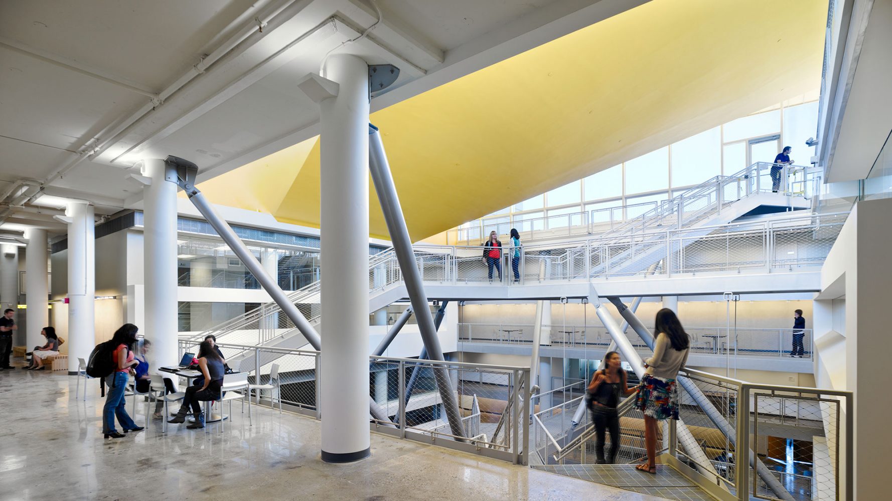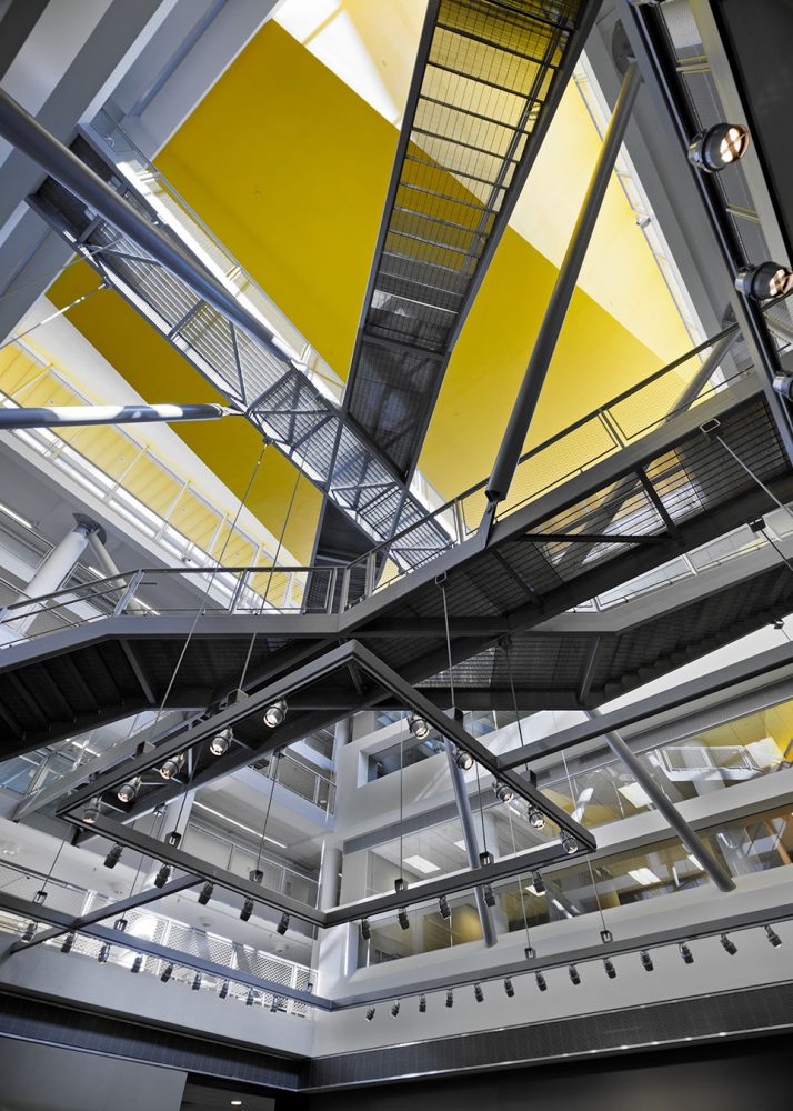 Partial mezzanine levels were inserted above the studio floors to provide space for faculty offices. These offices look over the open-plan design studios, through interior glazing, to a double-height space along the building perimeter that maximizes daylight in the studio areas. The corridors on the studio levels are wide, double-height volumes that accommodate informal lounge areas for relaxation and socializing, as well as pin-ups for studio “crit” spaces. Narrower balconies overlook the lounges and provide circulation on the office levels.