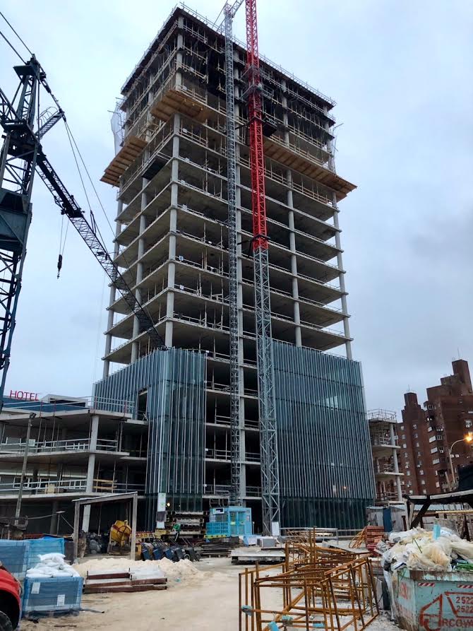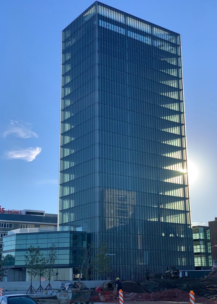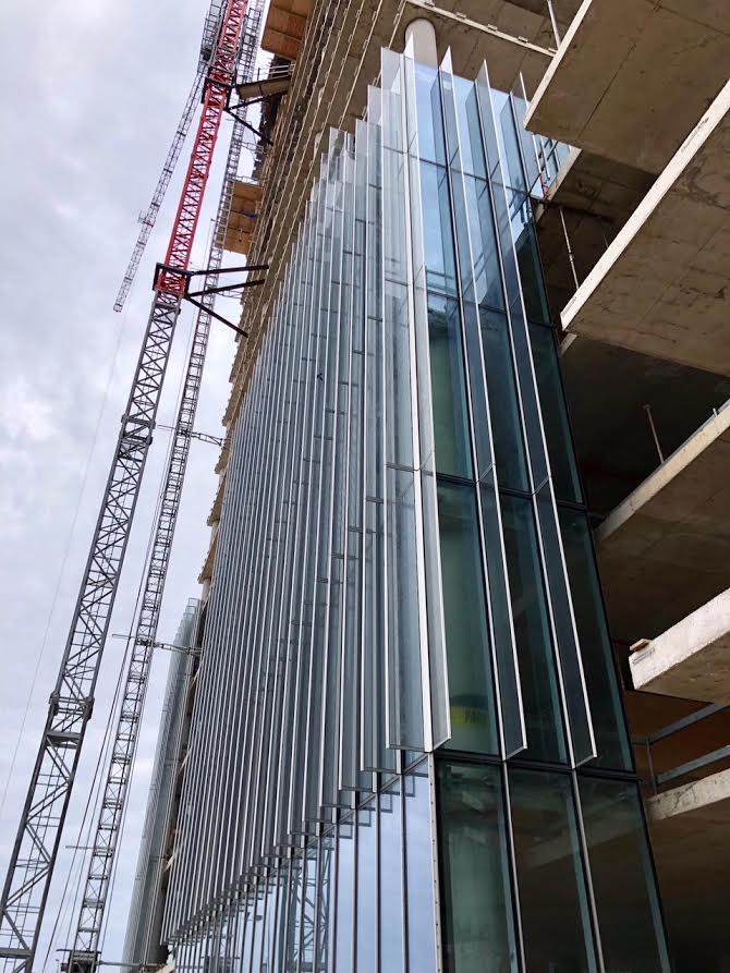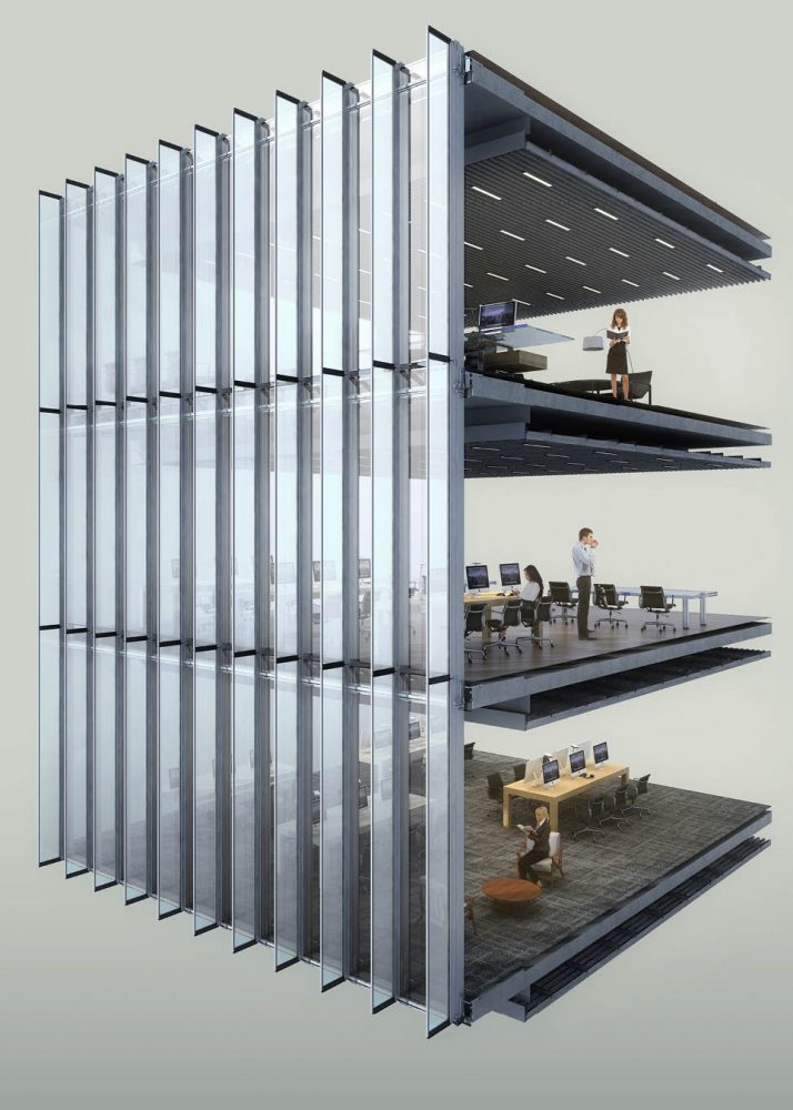 The facade’s fritted glass fins passively shade the floor-to-floor, low-e, triple-laminated unitized glazing panels to dramatically reduce energy consumption.