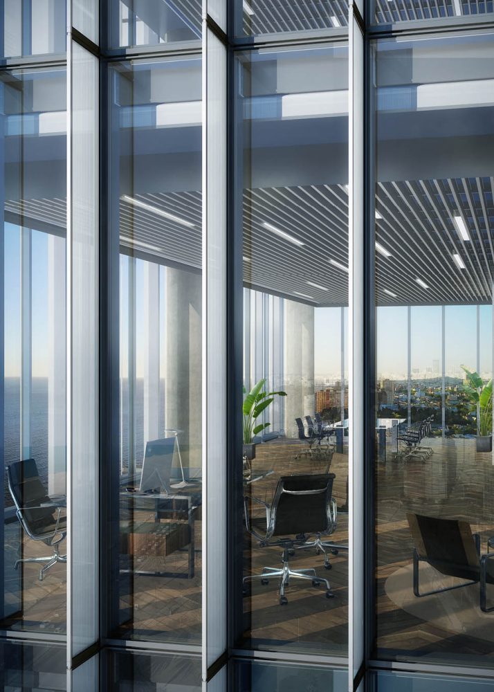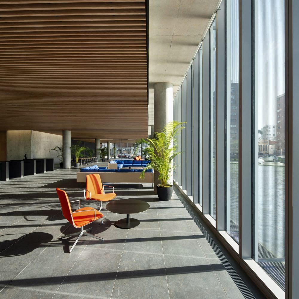 The building’s compact core, post-tensioned floor slab construction and efficient structural load distribution enable very generous, extremely flexible floor plate dimensions, at least 2.8 m clear from finished floor to finished ceiling, and full-height windows that bring in natural light and natural beauty.