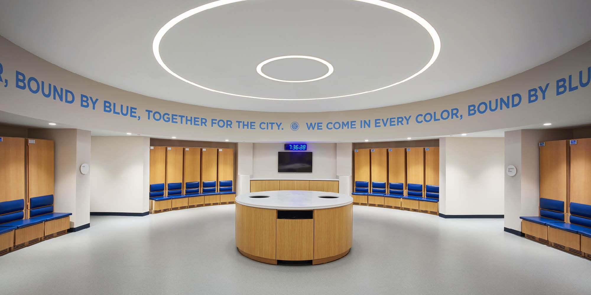 A circular dressing room of 32 lockers for the players is at the heart of the facility. All other player performance areas are positioned in direct proximity to this space and include a post-exercise aquatic recovery area, strength and conditioning gym, boot room, massage and medical treatment rooms, a team meeting room with theater-style seating, player lounge, dining hall, and other support spaces.