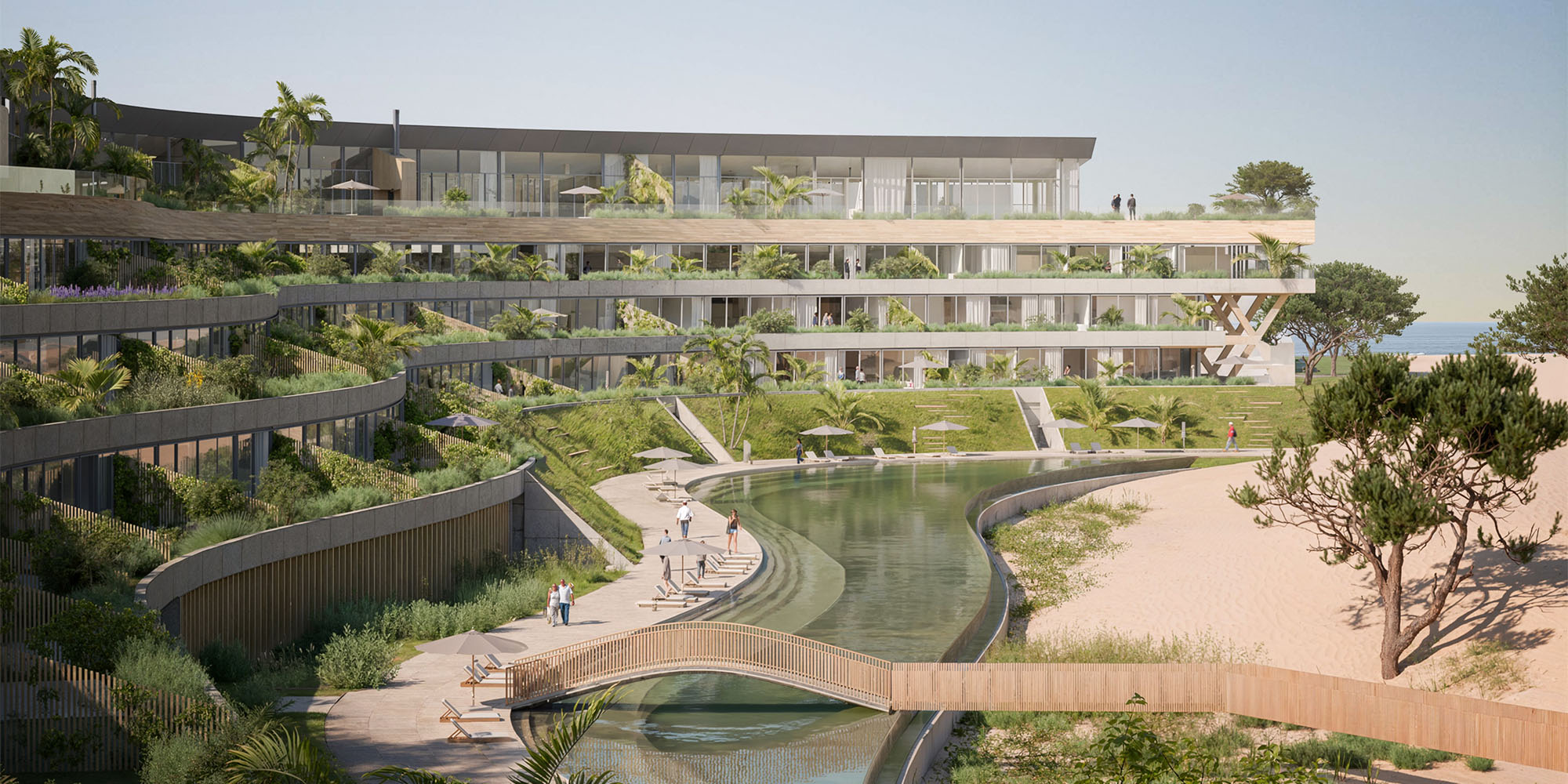 An oceanfront, multi-family residential building features a long, low-slung, and sinewy shape that integrates it with the organic landscape of its pristine setting to minimize its visual impact on the neighborhood and make it completely invisible from the public beach.