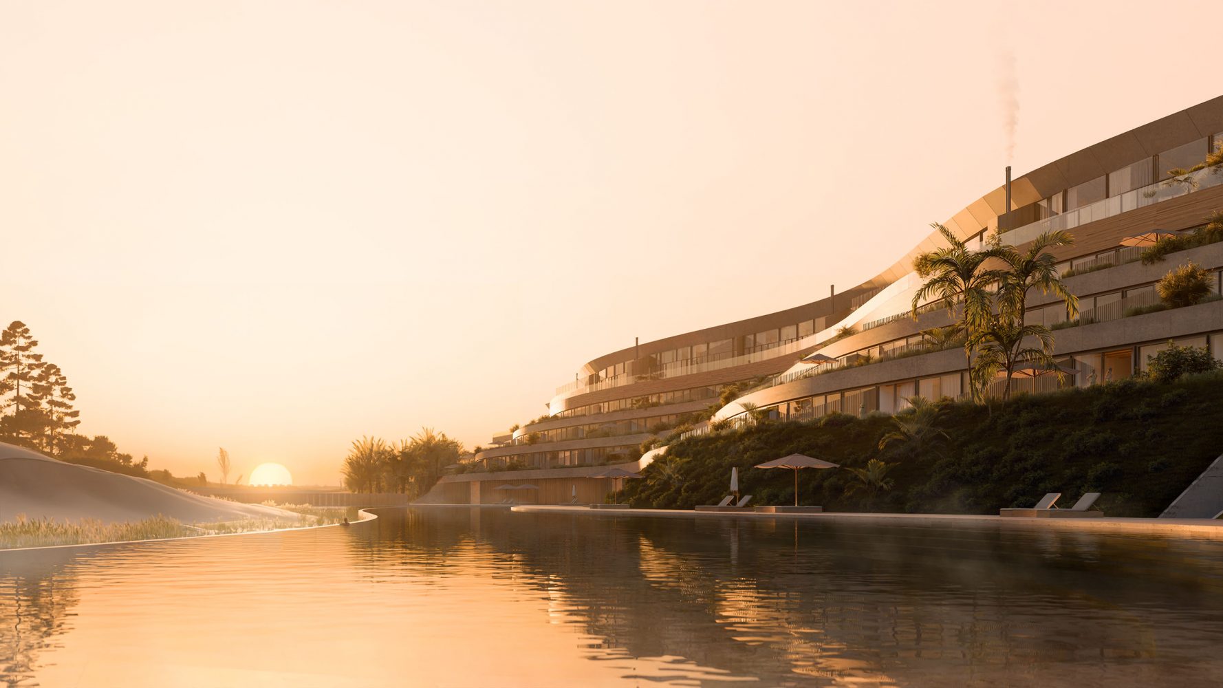 Médano El Pinar aims to be the first Nearly Zero-Energy Building and potentially carbon neutral construction in the region through the extensive use of locally sourced carbon sequestering building materials, utility-scale photovoltaic power generation, redundant centralized thermal plants, rainwater recapture, green roofing, heat pumps and ubiquitous cross ventilation.