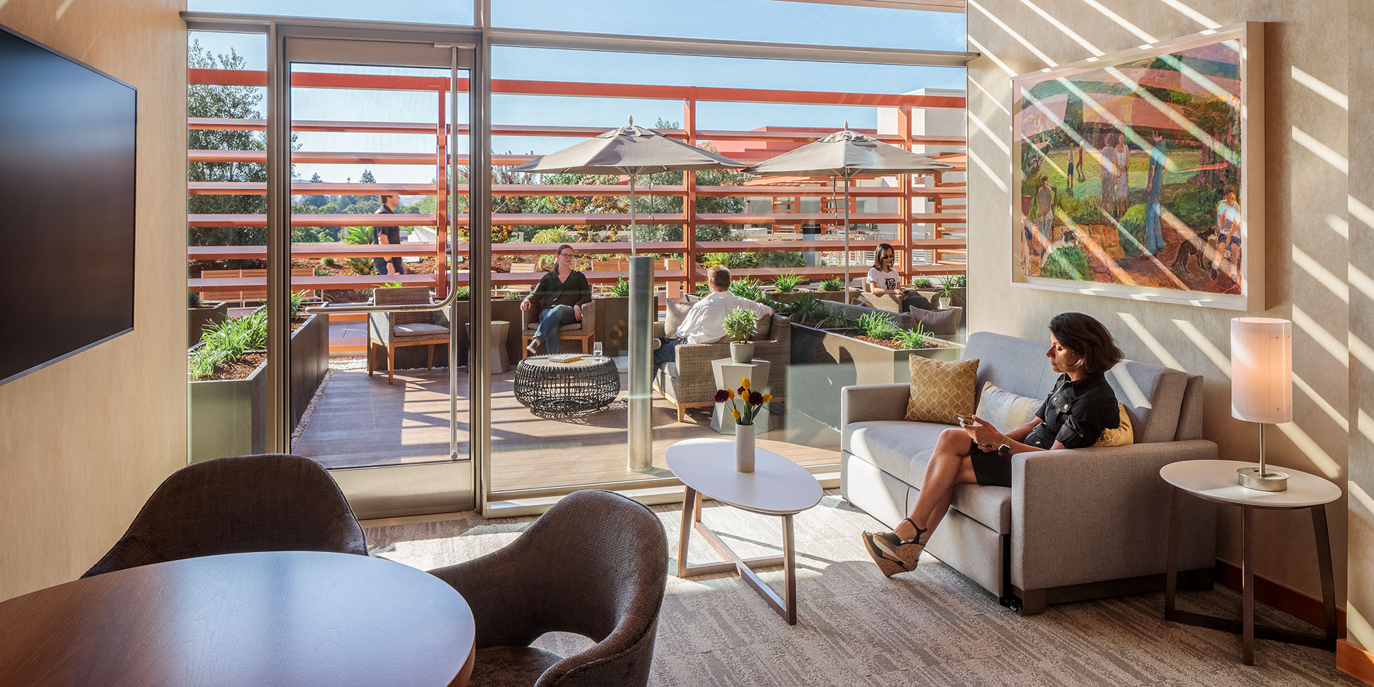 The design of the new facility reinterprets and updates the original 1959 Edward Durell Stone-designed hospital with open-air courtyards in a combination of a central atrium and rooftop green space. The atrium brings daylight and landscape to the lower levels, where a landscape feature and public amenities create a welcoming and memorable environment for patients, visitors, and staff alike. Roof gardens on the second and third floors provide additional outdoor spaces associated with the cafeteria and other public functions and are a complementary design to the courtyards and arcades found throughout Stanford University and its Medical Center campuses.