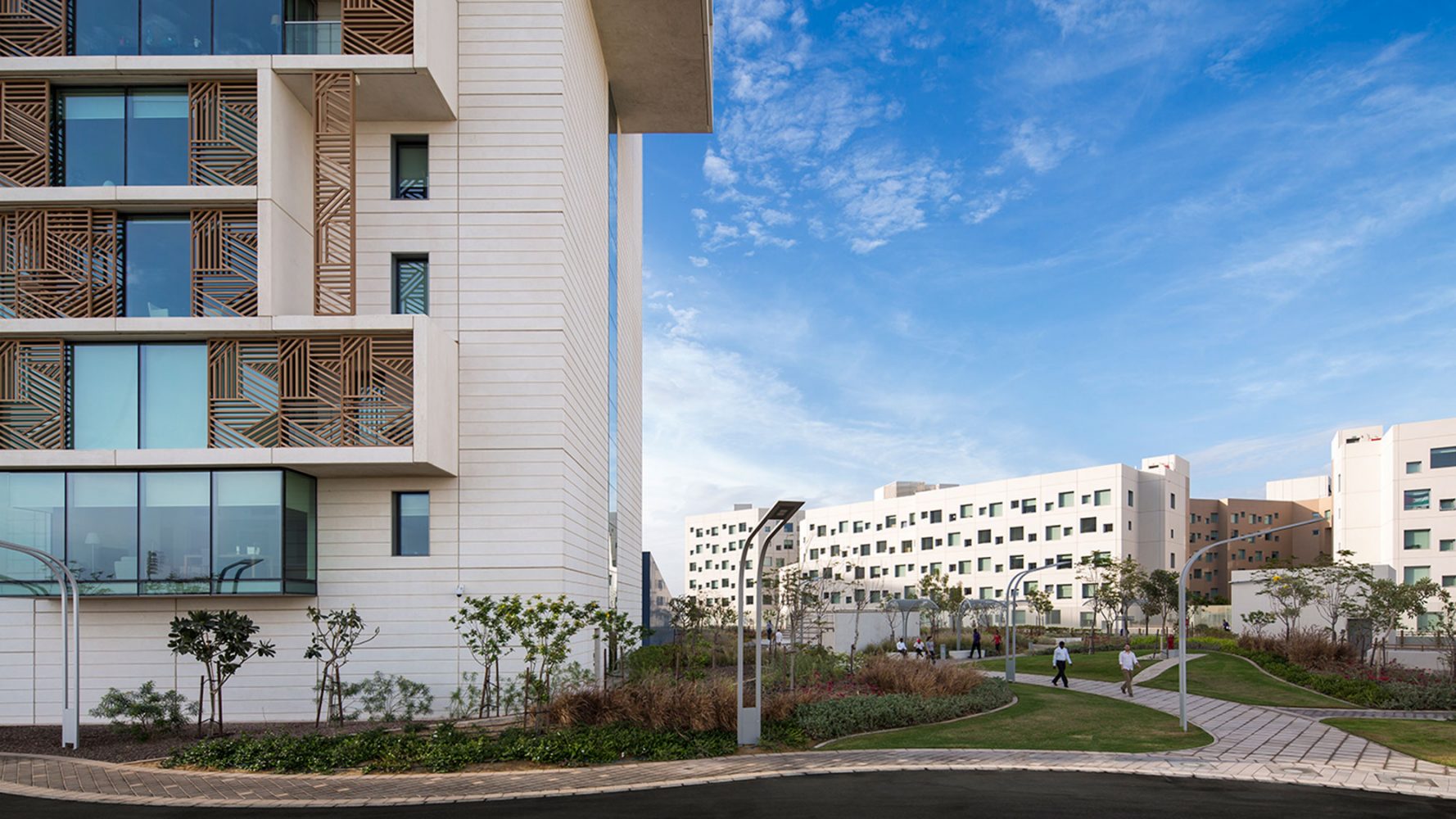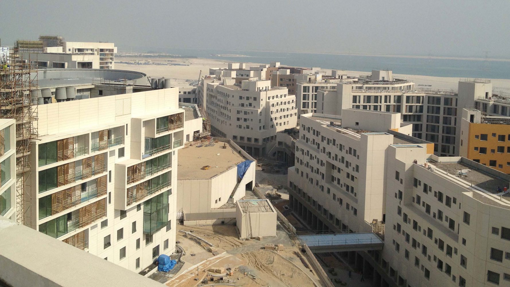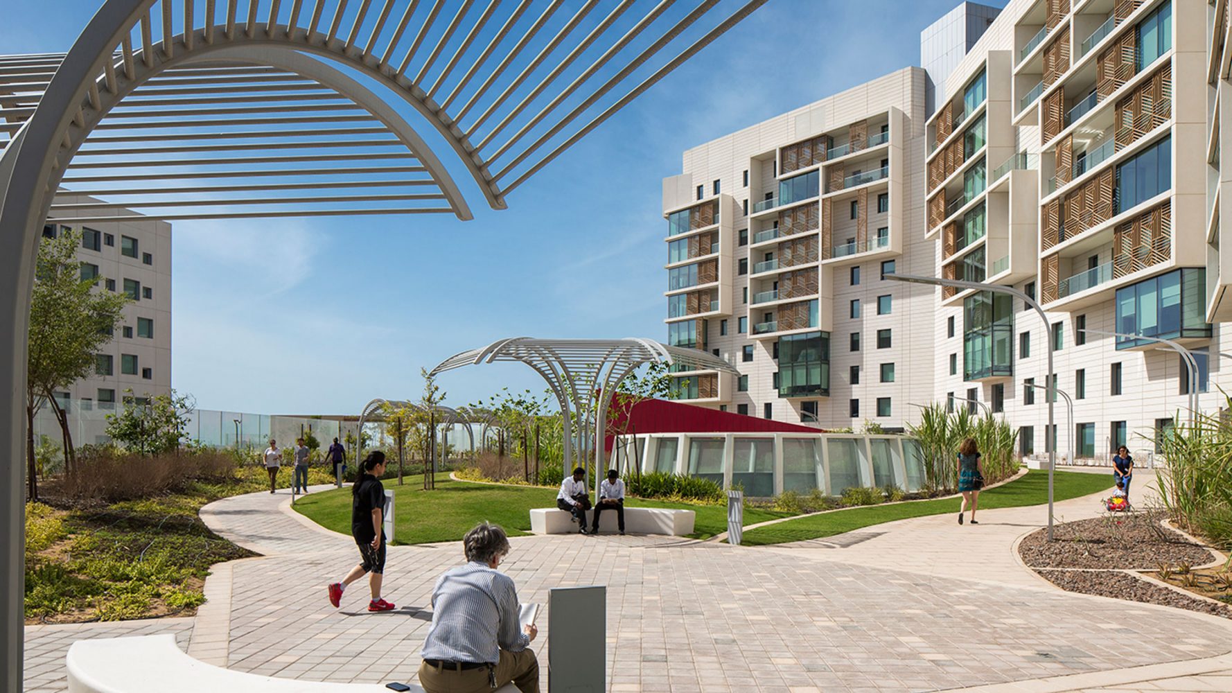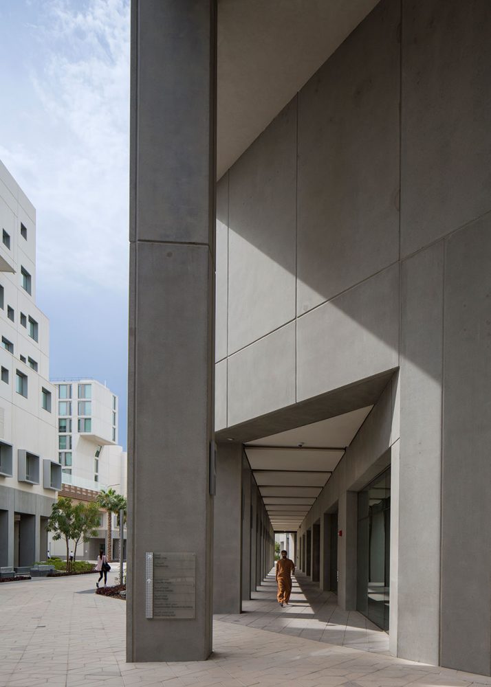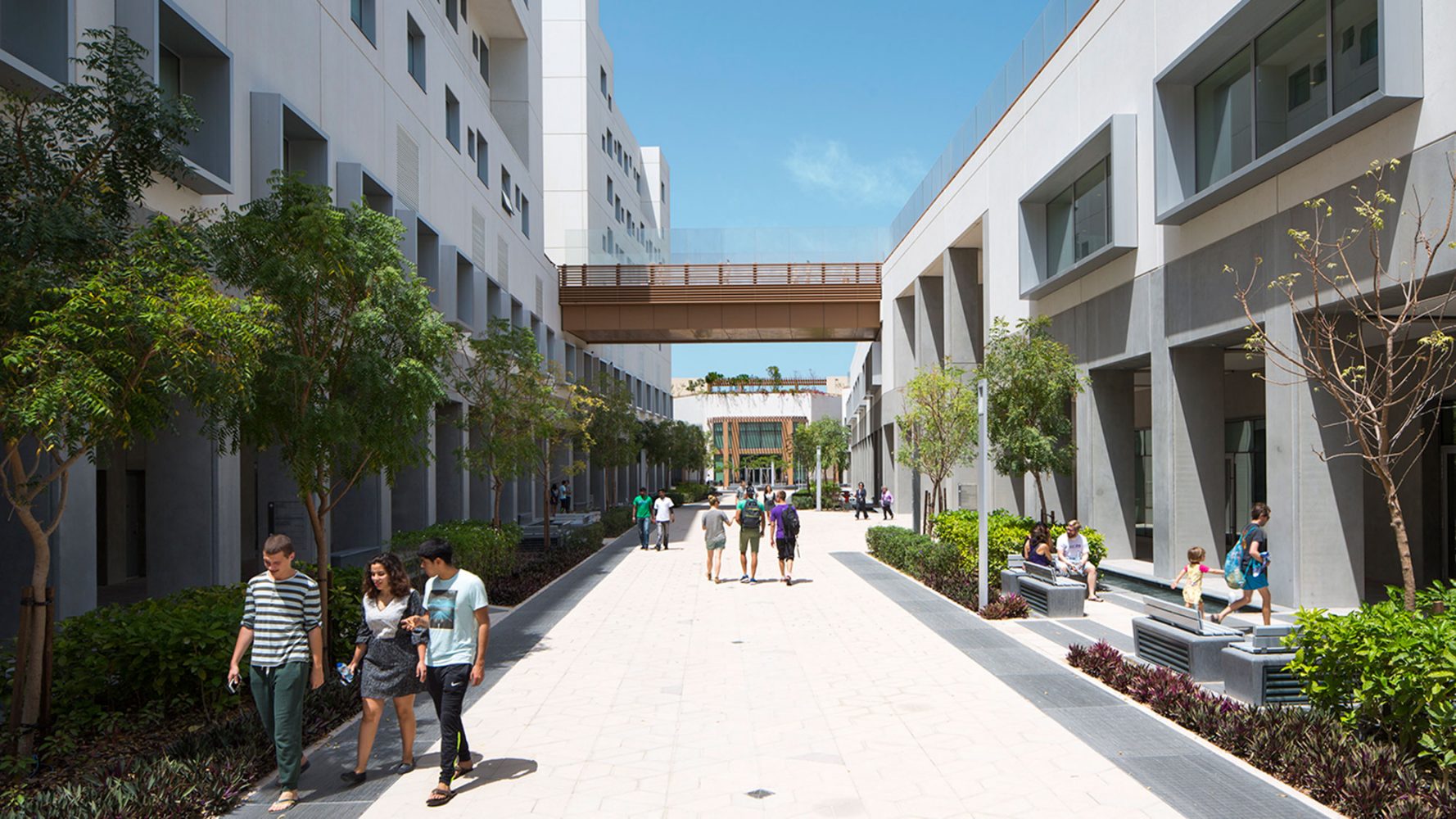 纽约大学阿布扎比分校的规划建立在一个空白但具有雄心的城市规划之上。项目仅有有限的当地建筑文脉与之对应,但其目标是创造一个紧凑,可步行的环境,用以激励跨学科交流的同时创造一个适应沙漠气候的环境。解决方法是设计一个两层的校园,具有狭窄街道以及合适体量的建筑来创造最优的遮阳以及根据盛行风组合建筑来加强自然通风。设计的街道尺度结合景观设计,通过利用柱廊,本地植物,棚架和传统水道以及城市形态,来创造一个全年舒适的户外空间。