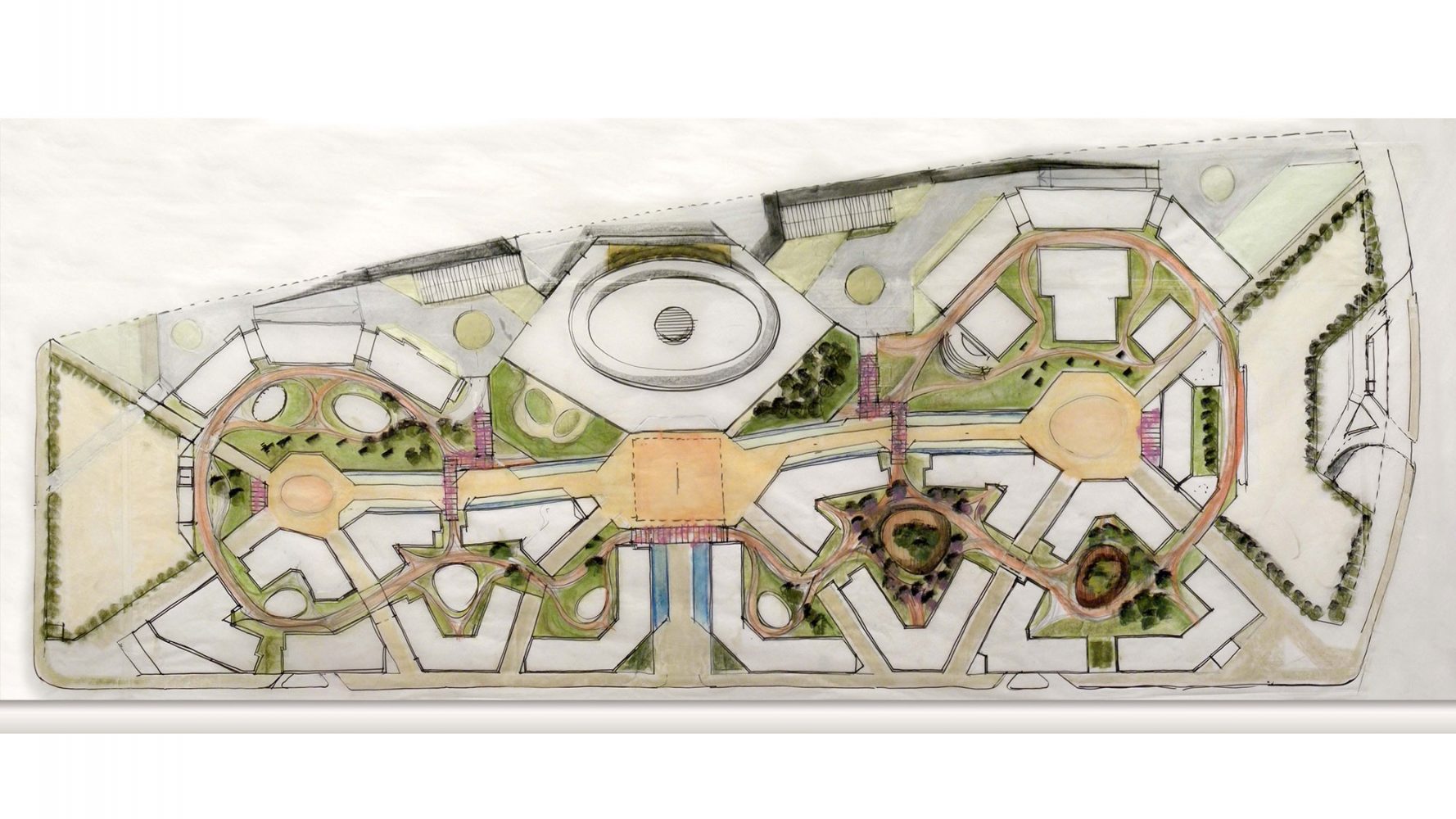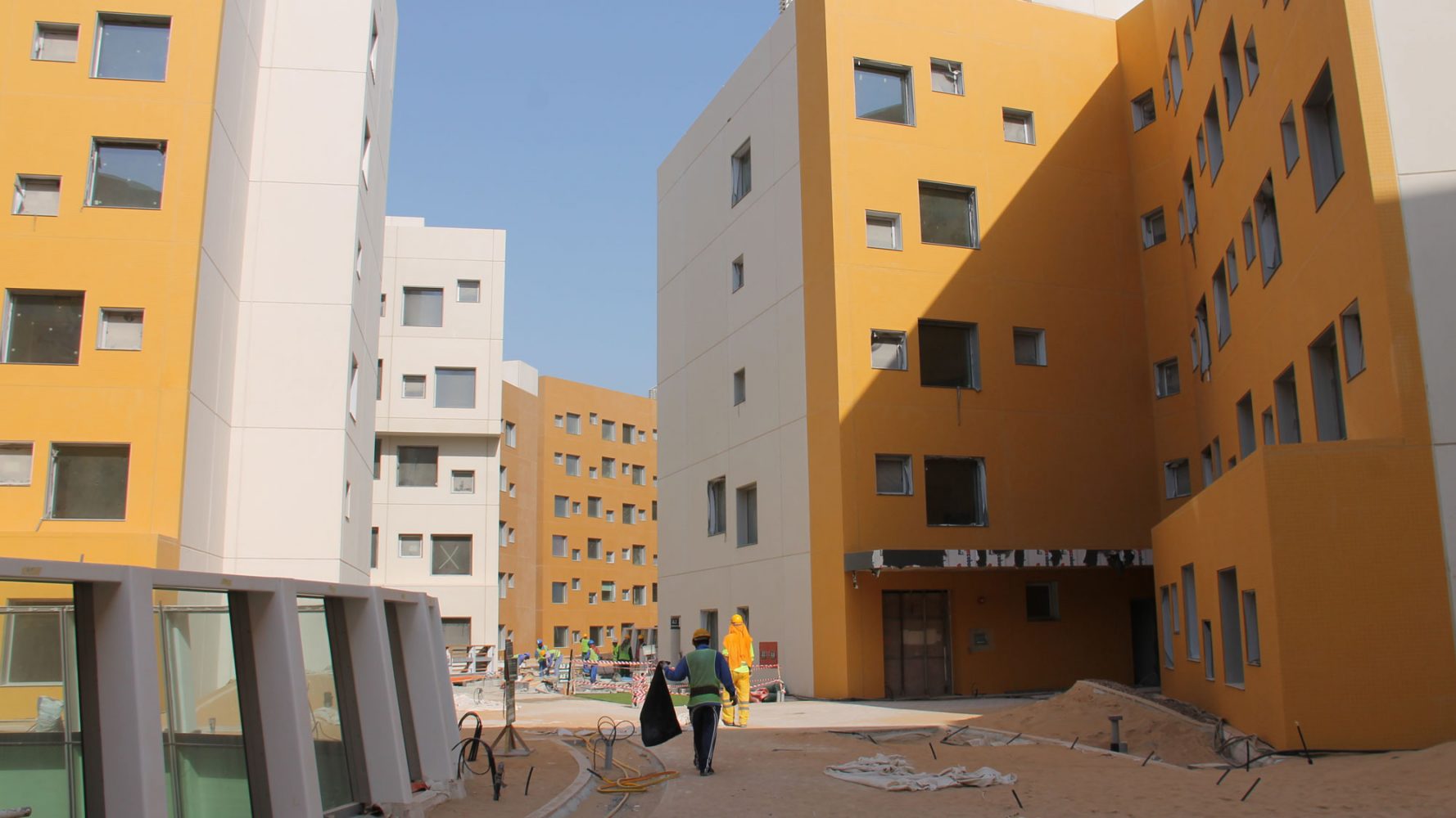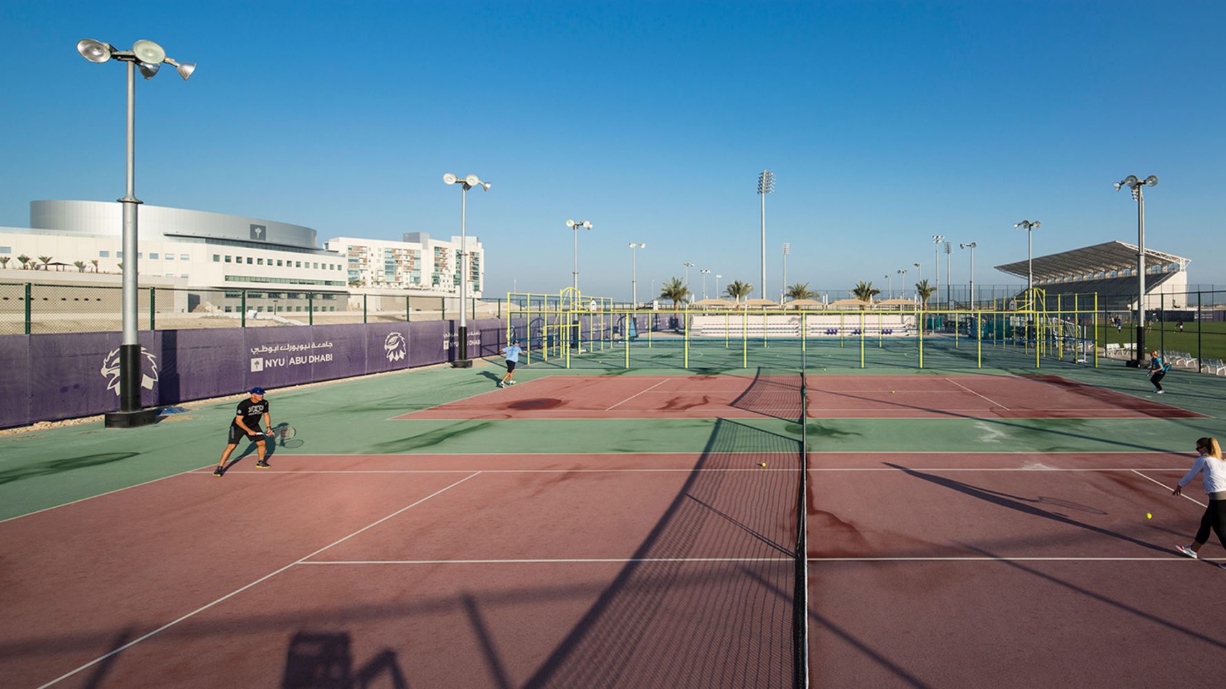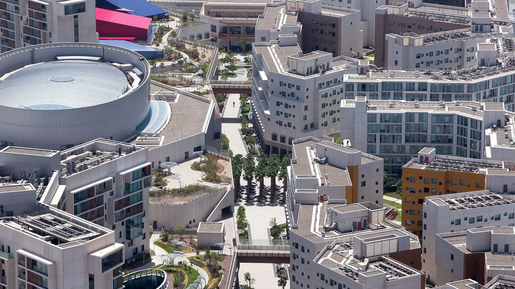 纽约大学阿布扎比分校的规划建立在一个空白但具有雄心的城市规划之上。项目仅有有限的当地建筑文脉与之对应,但其目标是创造一个紧凑,可步行的环境,用以激励跨学科交流的同时创造一个适应沙漠气候的环境。解决方法是设计一个两层的校园,具有狭窄街道以及合适体量的建筑来创造最优的遮阳以及根据盛行风组合建筑来加强自然通风。设计的街道尺度结合景观设计,通过利用柱廊,本地植物,棚架和传统水道以及城市形态,来创造一个全年舒适的户外空间。
