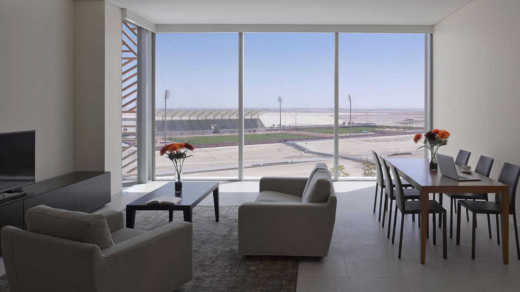 分层式的流线系统同时也让使用者可以体验密集的城市行走体验。项目内的所有建筑均为综合体。在地面层,校园主道和三个广场可通往学术空间,而二层的景观高架步道为学生和员工住宿提供可达性。这些竖向整合的建筑围绕着带有遮阳设施的室外社交空间布置,目标是为学生和研究院之间提供跨学科合作的可能性。