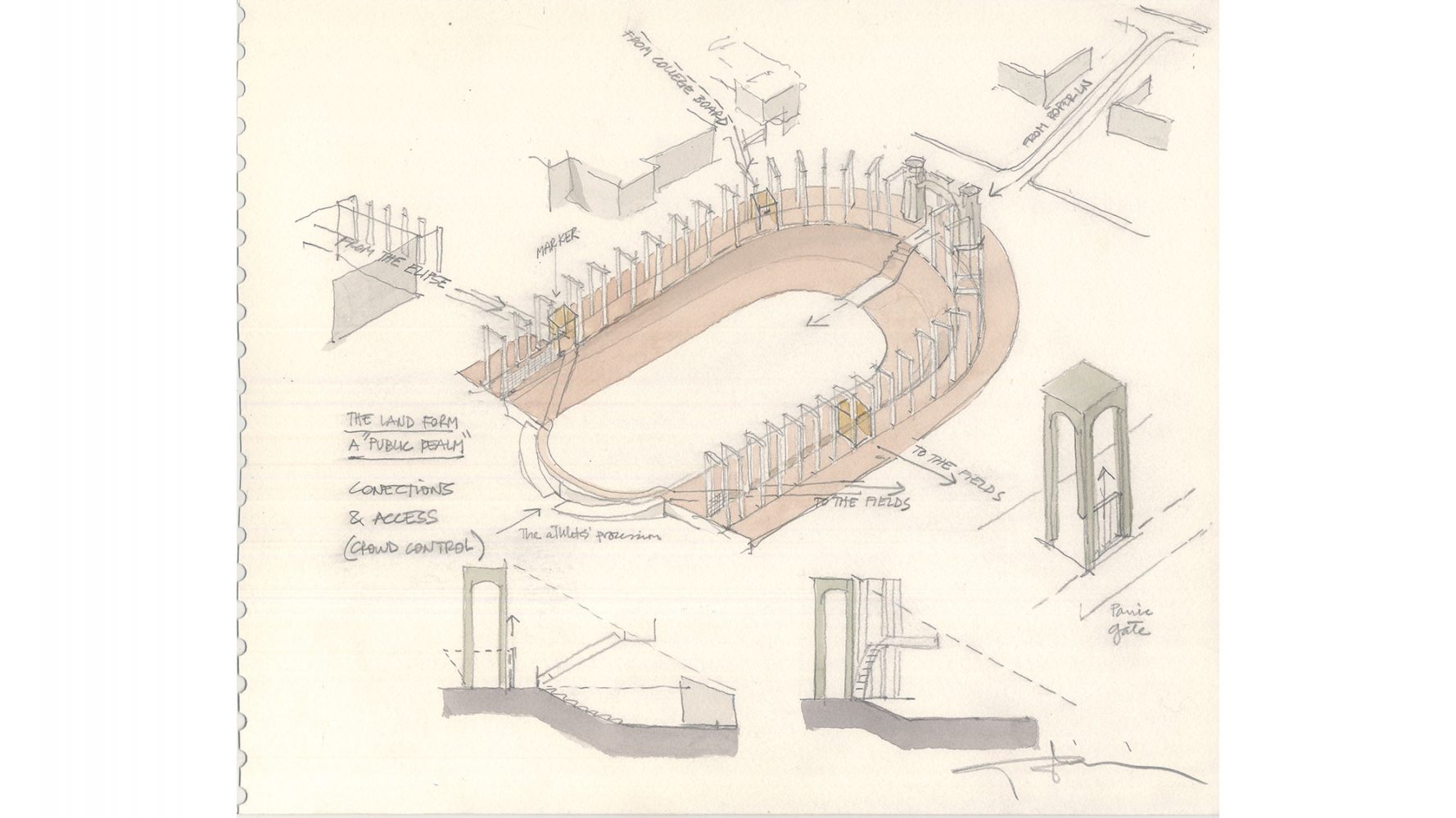 Replacing the University’s beloved but crumbling Palmer Stadium with a new multi-sport and education facility was further justified by creating a new kind of covered public space under the bleachers, which can be enjoyed independently of sporting events.
