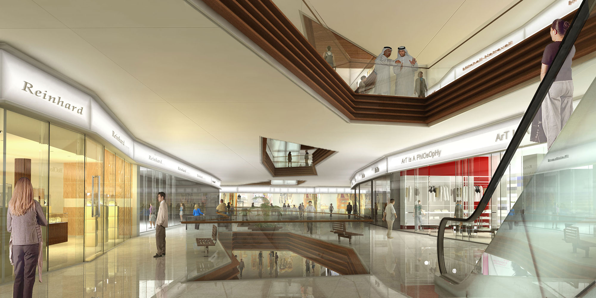 A promenade and a shaded restaurant pavilion define the waterfront, providing dining options, civic space, and visual and pedestrian connections to other districts to reinforce the urban character of the overall development. Inland from the pavilion and promenade lies the island’s primary shopping mall, a four-story complex containing high-end boutiques.