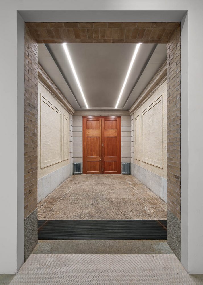 The ground floor restoration highlights Codman’s original vision, beginning with the façade’s rusticated limestone and tan brick, complemented by a new monumental wood entrance door, a faithful replica based on Codman’s original drawings from his archives. Inside, the porte cochère has been meticulously restored with a granite base, limestone accents, a herringbone brick paver floor, and coronet light fixtures. In the adjacent gallery, layers of past renovations were removed to reveal the building’s original penny-tile flooring and expose the concrete structure, offering a seamless blend of old and new.