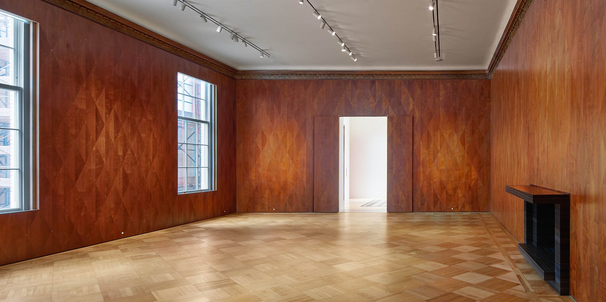 The third floor, the highest gallery level, houses the Wood Room, a richly detailed space featuring lattice-patterned mahogany-paneled walls, integrated art-hanging hardware, restored parquet floors, and carved wood crown molding. A new fireplace and oak door frames complete the room’s elegance. Adjacent, the southern gallery boasts restored and whitewashed parquet floors, Classic Gray gallery walls, and a combination of continuous linear and track lighting. Two distinctive staircases connect the lower-level galleries to the upper floors: a restored neo-Renaissance staircase with historic iron railings and limestone treads, and a second stair finished in rich gold paint, adding character to the gallery’s new administrative spaces.