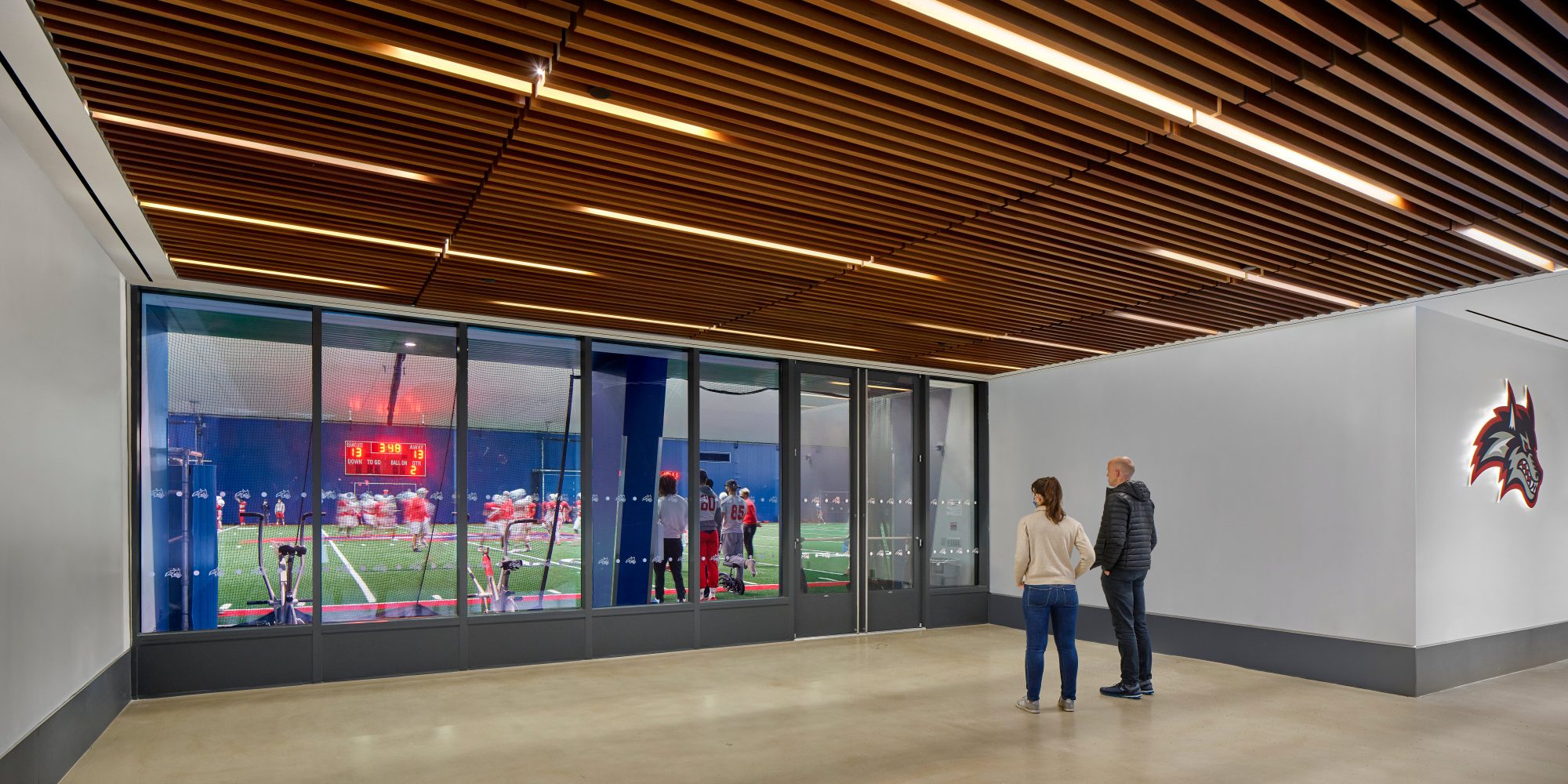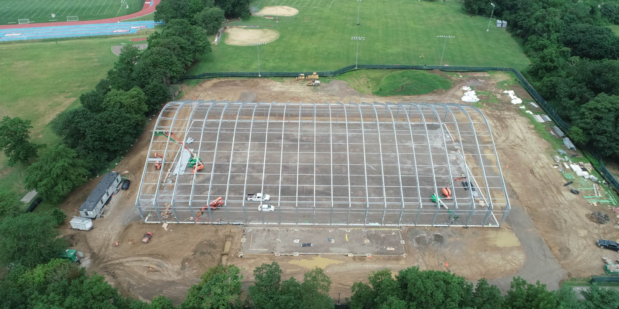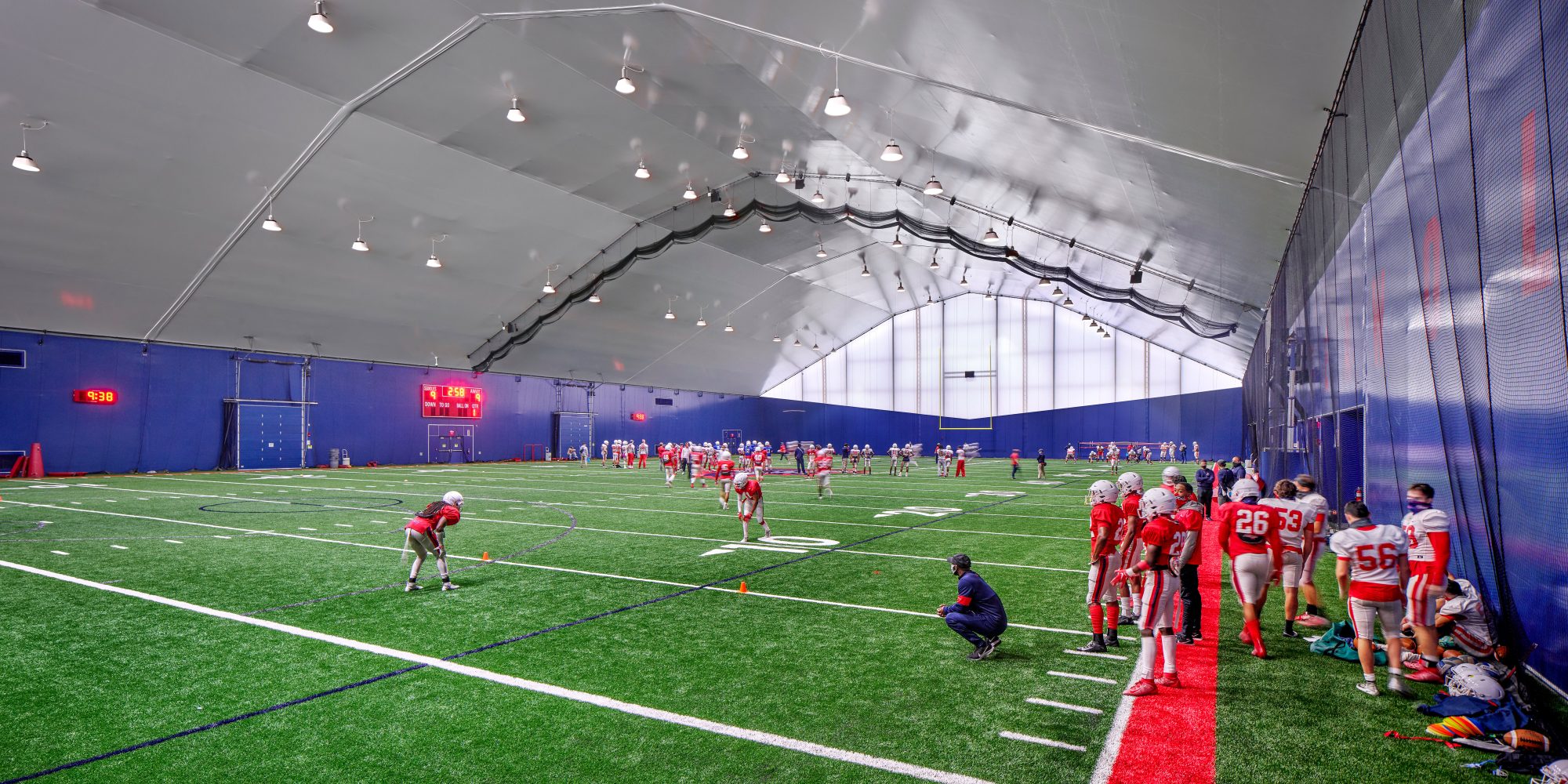 Completed in 2020, the Dubin Family Indoor Training Facility is anchored by a 180-foot-wide by 315-foot-long by 70-foot-high pre-fabricated, tension fabric structure covering an artificial turf field. The double skin, insulated fabric membrane structure, fabricated by Legacy Building Solutions, was tensioned over a galvanized steel frame. The structure was insulated using R 30 insulation and the interior liner provides a smooth, clean interior finish, allowing for superior acoustics, consistent reflection of lighting, and clean lines. An energy efficient LED field-of-play lighting system, installed by Musco, provides ideal illumination and motorized netting, installed by Athletic and Performance Rigging, enables the field to be sub-divided to enable the facility to be used by multiple teams simultaneously. The field-of-play is heated and cooled by two air handling units and two air-cooled dx condensing units, that can be remotely controlled through the existing campus BMS system.