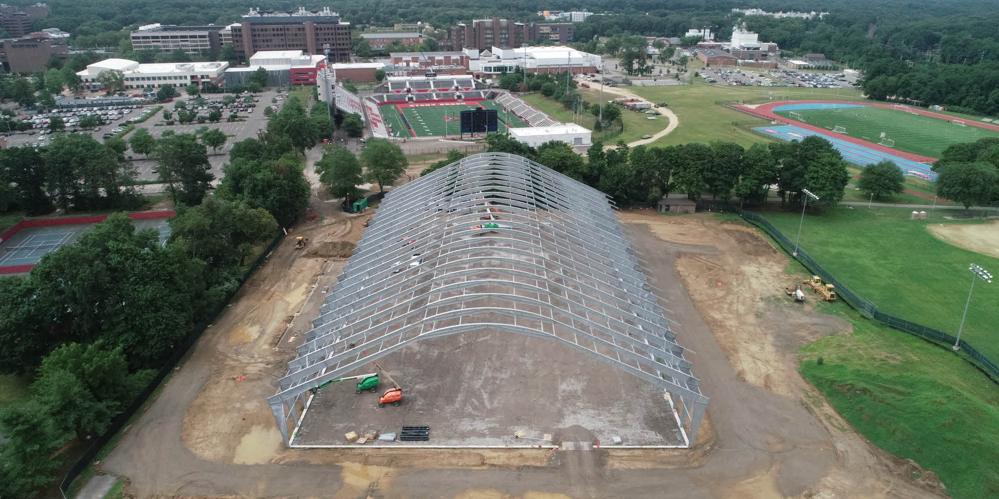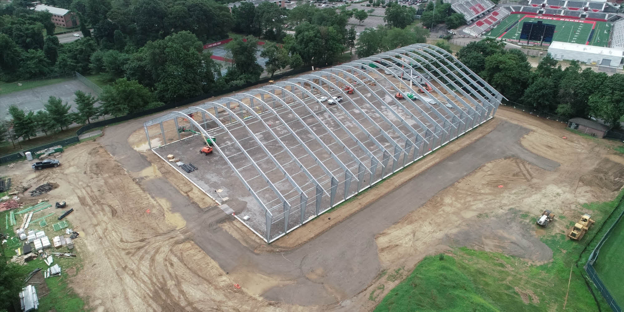A steel-supported tension fabric structure houses an indoor multi-purpose synthetic turf practice field and support facilities, and will feature innovative lighting, filming equipment, and sound and video systems. Designed for multi-use, the facility will provide intercollegiate athletic teams with year-round practice and training space.